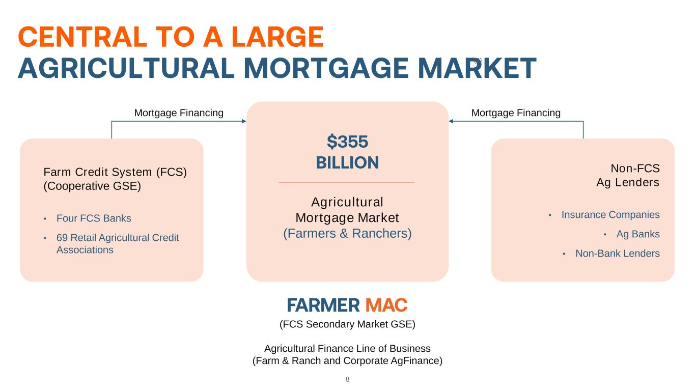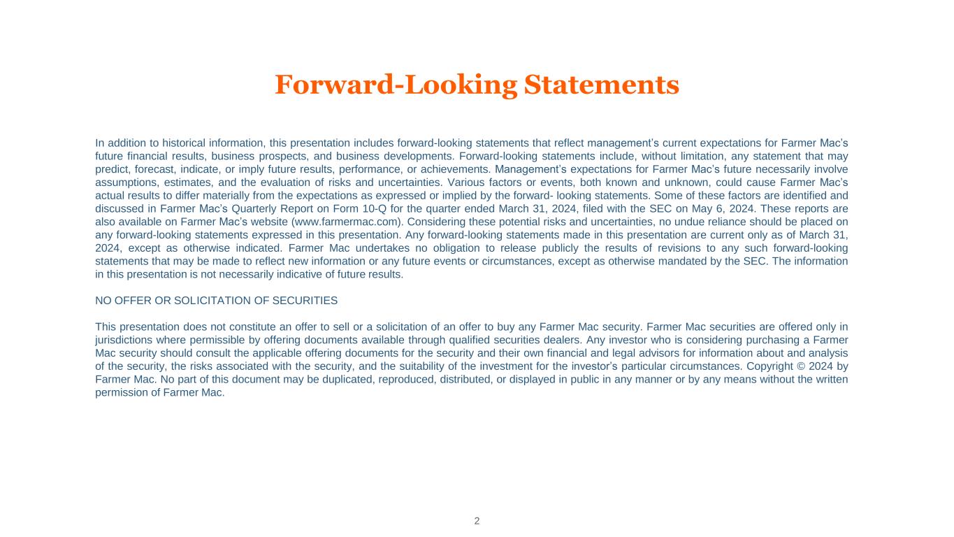 Forward-Looking Statements 2 In addition to historical information, this presentation includes forward-looking statements that reflect management’s current expectations for Farmer Mac’s future financial results, business prospects, and business developments. Forward-looking statements include, without limitation, any statement that may predict, forecast, indicate, or imply future results, performance, or achievements. Management’s expectations for Farmer Mac’s future necessarily involve assumptions, estimates, and the evaluation of risks and uncertainties. Various factors or events, both known and unknown, could cause Farmer Mac’s actual results to differ materially from the expectations as expressed or implied by the forward- looking statements. Some of these factors are identified and discussed in Farmer Mac’s Quarterly Report on Form 10-Q for the quarter ended March 31, 2024, filed with the SEC on May 6, 2024. These reports are also available on Farmer Mac’s website (www.farmermac.com). Considering these potential risks and uncertainties, no undue reliance should be placed on any forward-looking statements expressed in this presentation. Any forward-looking statements made in this presentation are current only as of March 31, 2024, except as otherwise indicated. Farmer Mac undertakes no obligation to release publicly the results of revisions to any such forward-looking statements that may be made to reflect new information or any future events or circumstances, except as otherwise mandated by the SEC. The information in this presentation is not necessarily indicative of future results. NO OFFER OR SOLICITATION OF SECURITIES This presentation does not constitute an offer to sell or a solicitation of an offer to buy any Farmer Mac security. Farmer Mac securities are offered only in jurisdictions where permissible by offering documents available through qualified securities dealers. Any investor who is considering purchasing a Farmer Mac security should consult the applicable offering documents for the security and their own financial and legal advisors for information about and analysis of the security, the risks associated with the security, and the suitability of the investment for the investor’s particular circumstances. Copyright © 2024 by Farmer Mac. No part of this document may be duplicated, reproduced, distributed, or displayed in public in any manner or by any means without the written permission of Farmer Mac.