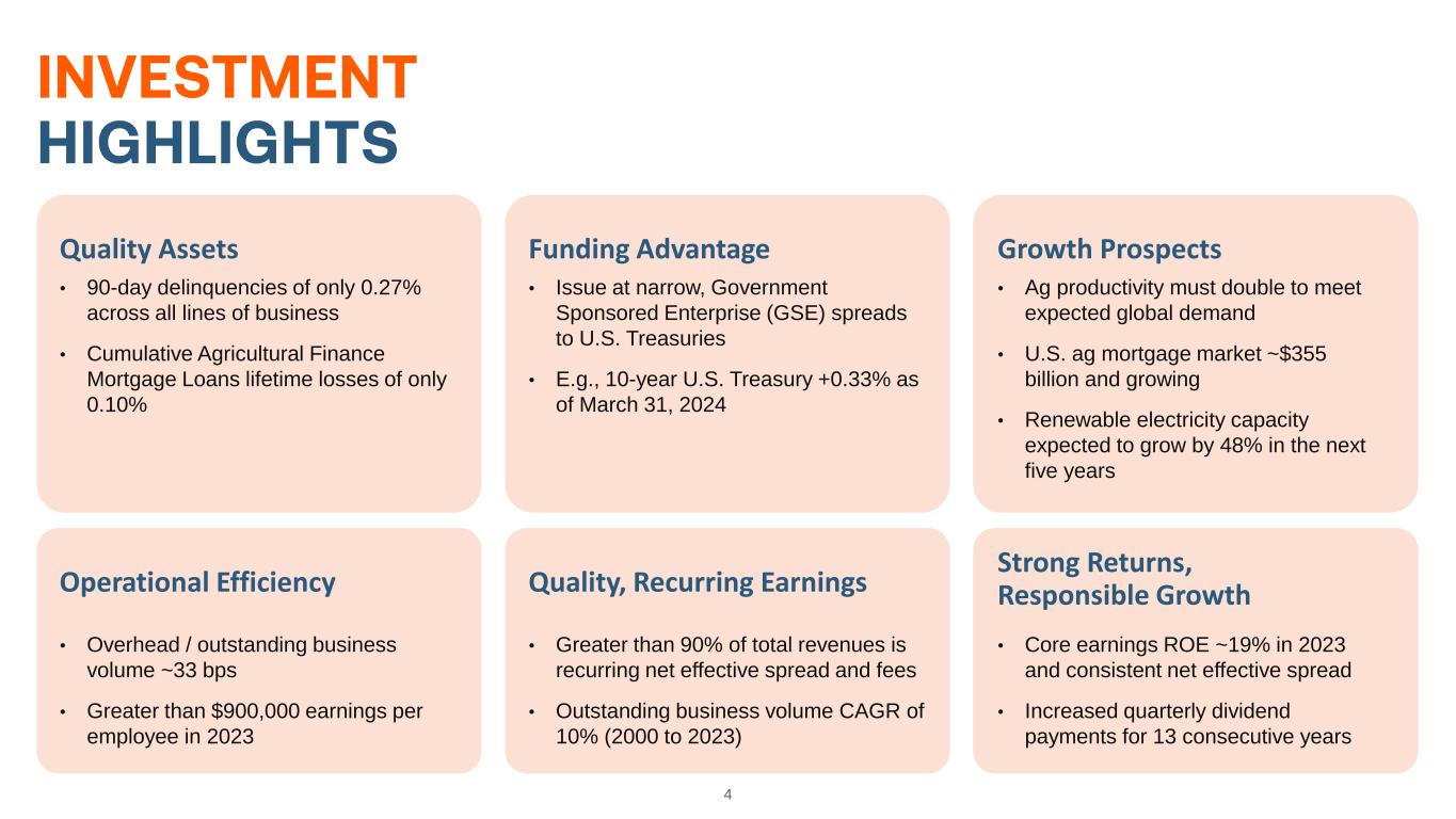 Use of Non-GAAP Financial Measures 3 This presentation is for general informational purposes only, is current only as of March 31, 2024 and should be read in conjunction with Farmer Mac’s Quarterly Report on Form 10-Q filed with the SEC on May 6, 2024. In the accompanying analysis of its financial information, Farmer Mac uses the following non-GAAP financial measures: core earnings, core earnings per share, and net effective spread. Farmer Mac uses these non-GAAP measures to measure corporate economic performance and develop financial plans because, in management's view, they are useful alternative measures in understanding Farmer Mac's economic performance, transaction economics, and business trends. The non-GAAP financial measures that Farmer Mac uses may not be comparable to similarly labeled non-GAAP financial measures disclosed by other companies. Farmer Mac's disclosure of these non-GAAP financial measures is intended to be supplemental in nature and is not meant to be considered in isolation from, as a substitute for, or as more important than, the related financial information prepared in accordance with GAAP. Core earnings and core earnings per share principally differ from net income attributable to common stockholders and earnings per common share, respectively, by excluding the effects of fair value fluctuations. These fluctuations are not expected to have a cumulative net impact on Farmer Mac's financial condition or results of operations reported in accordance with GAAP if the related financial instruments are held to maturity, as is expected. Core earnings and core earnings per share also differ from net income attributable to common stockholders and earnings per common share, respectively, by excluding specified infrequent or unusual transactions that Farmer Mac believes are not indicative of future operating results and that may not reflect the trends and economic financial performance of Farmer Mac's core business. Farmer Mac uses net effective spread to measure the net spread Farmer Mac earns between its interest-earning assets and the related net funding costs of these assets. Net effective spread differs from net interest income and net interest yield because it excludes: (1) the interest income and interest expense associated with the consolidated trusts and the average balance of the loans underlying these trusts; and (2) the fair value changes of financial derivatives and the corresponding assets or liabilities designated in fair value hedge accounting relationships. Net effective spread also principally differs from net interest income and net interest yield because it includes the accrual of income and expense related to the contractual amounts due on financial derivatives that are not designated in hedge accounting relationships ("undesignated financial derivatives") and the net effects of terminations or net settlements on financial derivatives, which consist of: (1) the net effects of cash settlements on agency forward contracts on the debt of other GSEs and U.S. Treasury security futures that we use as short-term economic hedges on the issuance of debt; and (2) the net effects of initial cash payments that Farmer Mac receives upon the inception of certain swaps.