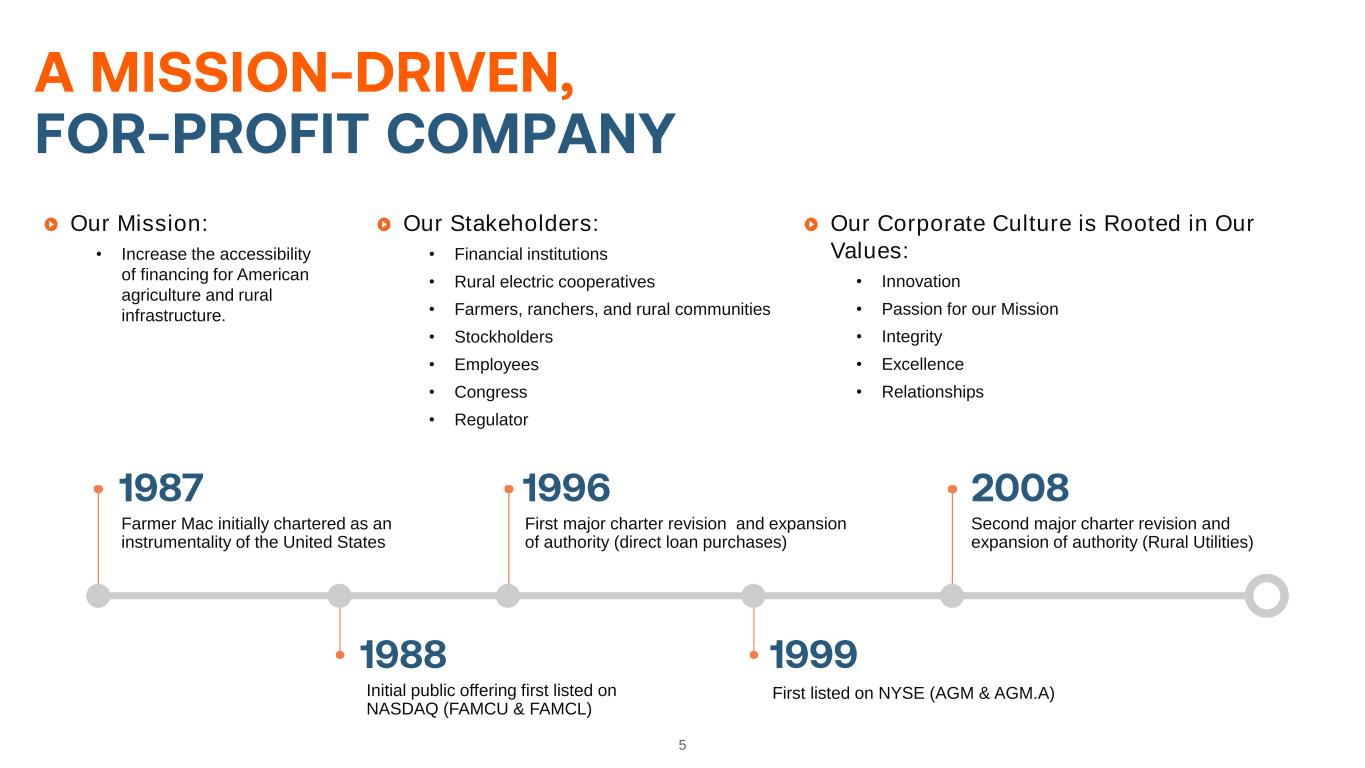4 • 90-day delinquencies of only 0.27% across all lines of business • Cumulative Agricultural Finance Mortgage Loans lifetime losses of only 0.10% Quality Assets • Issue at narrow, Government Sponsored Enterprise (GSE) spreads to U.S. Treasuries • E.g., 10-year U.S. Treasury +0.33% as of March 31, 2024 Funding Advantage • Ag productivity must double to meet expected global demand • U.S. ag mortgage market ~$355 billion and growing • Renewable electricity capacity expected to grow by 48% in the next five years Growth Prospects • Overhead / outstanding business volume ~33 bps • Greater than $900,000 earnings per employee in 2023 Operational Efficiency • Greater than 90% of total revenues is recurring net effective spread and fees • Outstanding business volume CAGR of 10% (2000 to 2023) Quality, Recurring Earnings • Core earnings ROE ~19% in 2023 and consistent net effective spread • Increased quarterly dividend payments for 13 consecutive years Strong Returns, Responsible Growth
