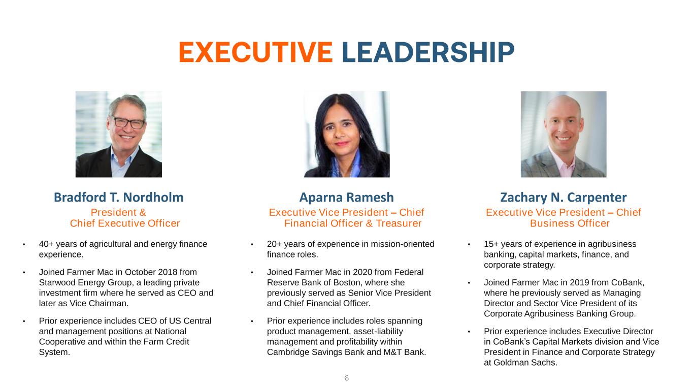 5 First listed on NYSE (AGM & AGM.A)Initial public offering first listed on NASDAQ (FAMCU & FAMCL) Farmer Mac initially chartered as an instrumentality of the United States First major charter revision and expansion of authority (direct loan purchases) Second major charter revision and expansion of authority (Rural Utilities) Our Mission: • Increase the accessibility of financing for American agriculture and rural infrastructure. Our Stakeholders: • Financial institutions • Rural electric cooperatives • Farmers, ranchers, and rural communities • Stockholders • Employees • Congress • Regulator Our Corporate Culture is Rooted in Our Values: • Innovation • Passion for our Mission • Integrity • Excellence • Relationships