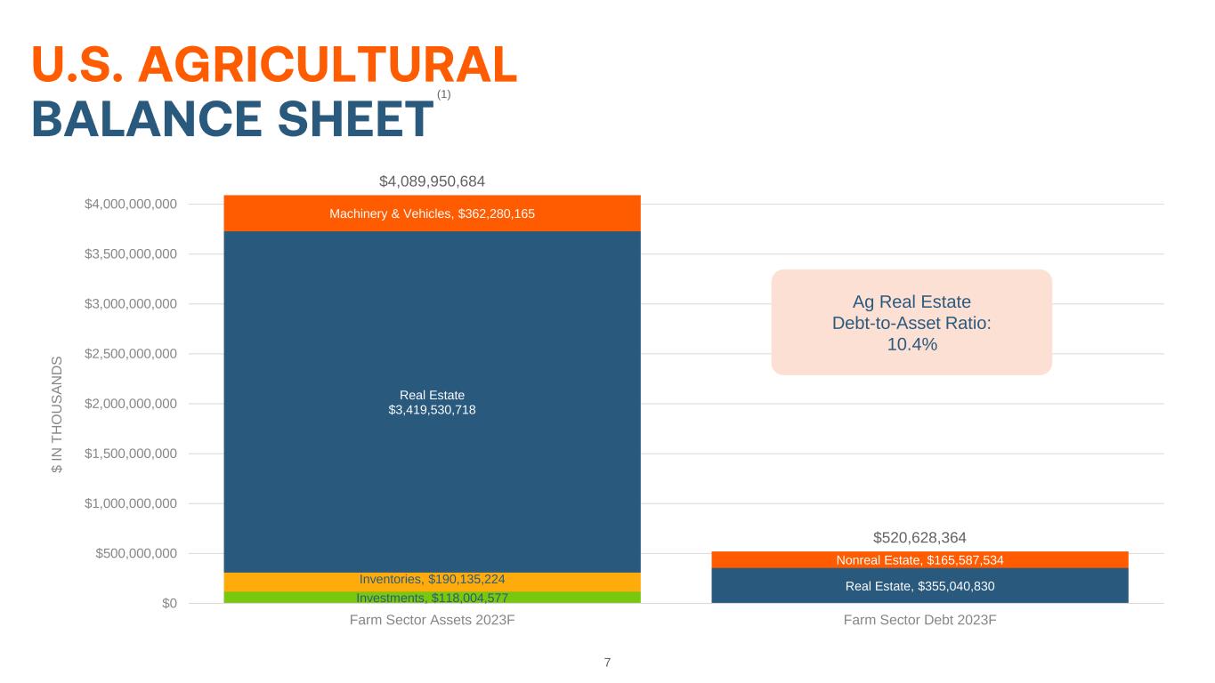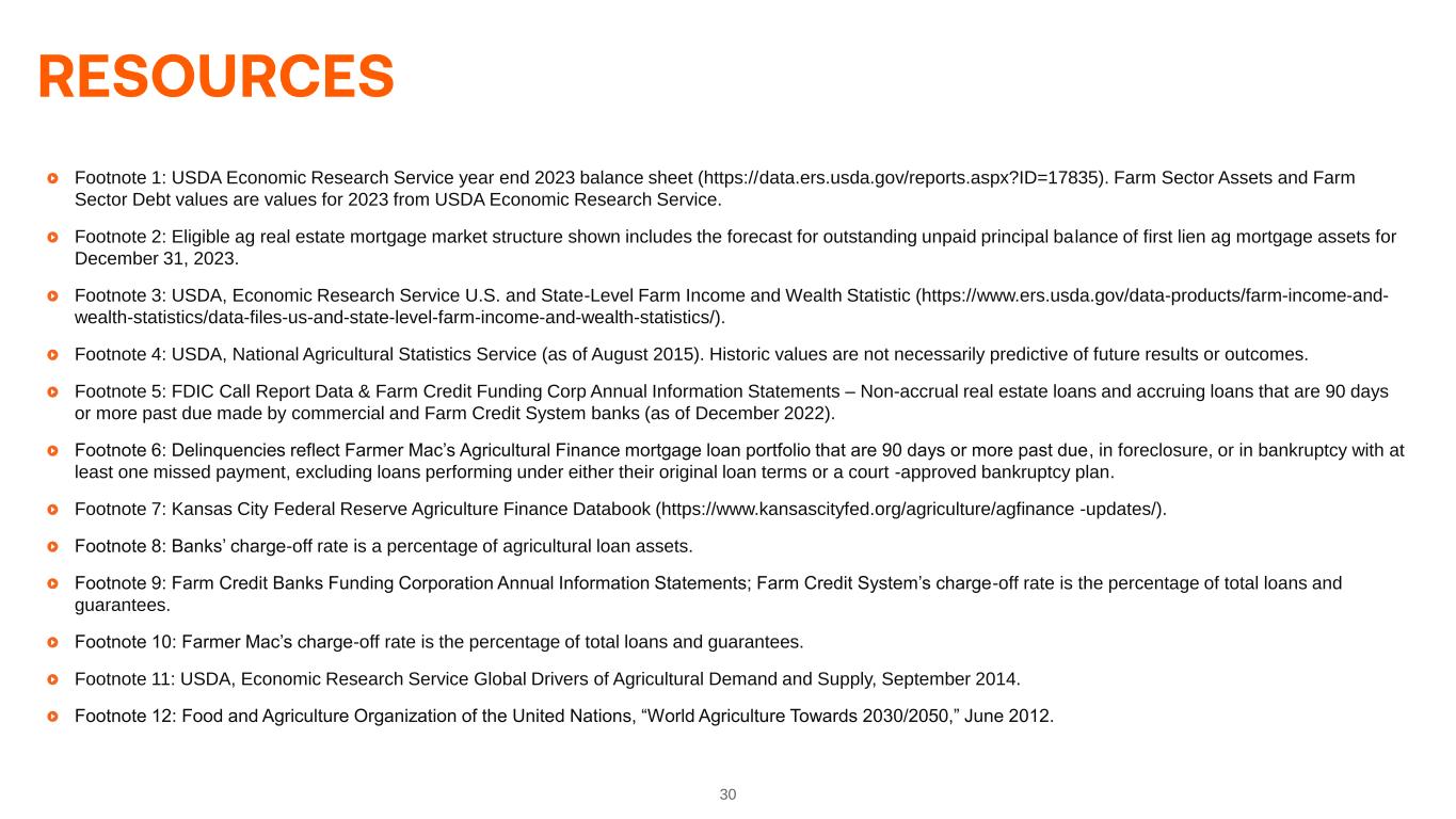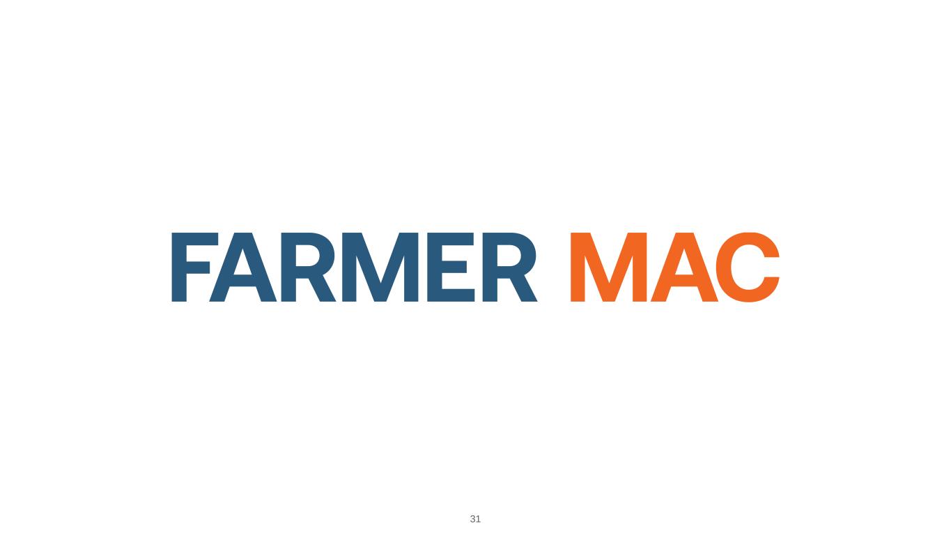 30 Footnote 1: USDA Economic Research Service year end 2023 balance sheet (https://data.ers.usda.gov/reports.aspx?ID=17835). Farm Sector Assets and Farm Sector Debt values are values for 2023 from USDA Economic Research Service. Footnote 2: Eligible ag real estate mortgage market structure shown includes the forecast for outstanding unpaid principal balance of first lien ag mortgage assets for December 31, 2023. Footnote 3: USDA, Economic Research Service U.S. and State-Level Farm Income and Wealth Statistic (https://www.ers.usda.gov/data-products/farm-income-and- wealth-statistics/data-files-us-and-state-level-farm-income-and-wealth-statistics/). Footnote 4: USDA, National Agricultural Statistics Service (as of August 2015). Historic values are not necessarily predictive of future results or outcomes. Footnote 5: FDIC Call Report Data & Farm Credit Funding Corp Annual Information Statements – Non-accrual real estate loans and accruing loans that are 90 days or more past due made by commercial and Farm Credit System banks (as of December 2022). Footnote 6: Delinquencies reflect Farmer Mac’s Agricultural Finance mortgage loan portfolio that are 90 days or more past due, in foreclosure, or in bankruptcy with at least one missed payment, excluding loans performing under either their original loan terms or a court -approved bankruptcy plan. Footnote 7: Kansas City Federal Reserve Agriculture Finance Databook (https://www.kansascityfed.org/agriculture/agfinance -updates/). Footnote 8: Banks’ charge-off rate is a percentage of agricultural loan assets. Footnote 9: Farm Credit Banks Funding Corporation Annual Information Statements; Farm Credit System’s charge-off rate is the percentage of total loans and guarantees. Footnote 10: Farmer Mac’s charge-off rate is the percentage of total loans and guarantees. Footnote 11: USDA, Economic Research Service Global Drivers of Agricultural Demand and Supply, September 2014. Footnote 12: Food and Agriculture Organization of the United Nations, “World Agriculture Towards 2030/2050,” June 2012.