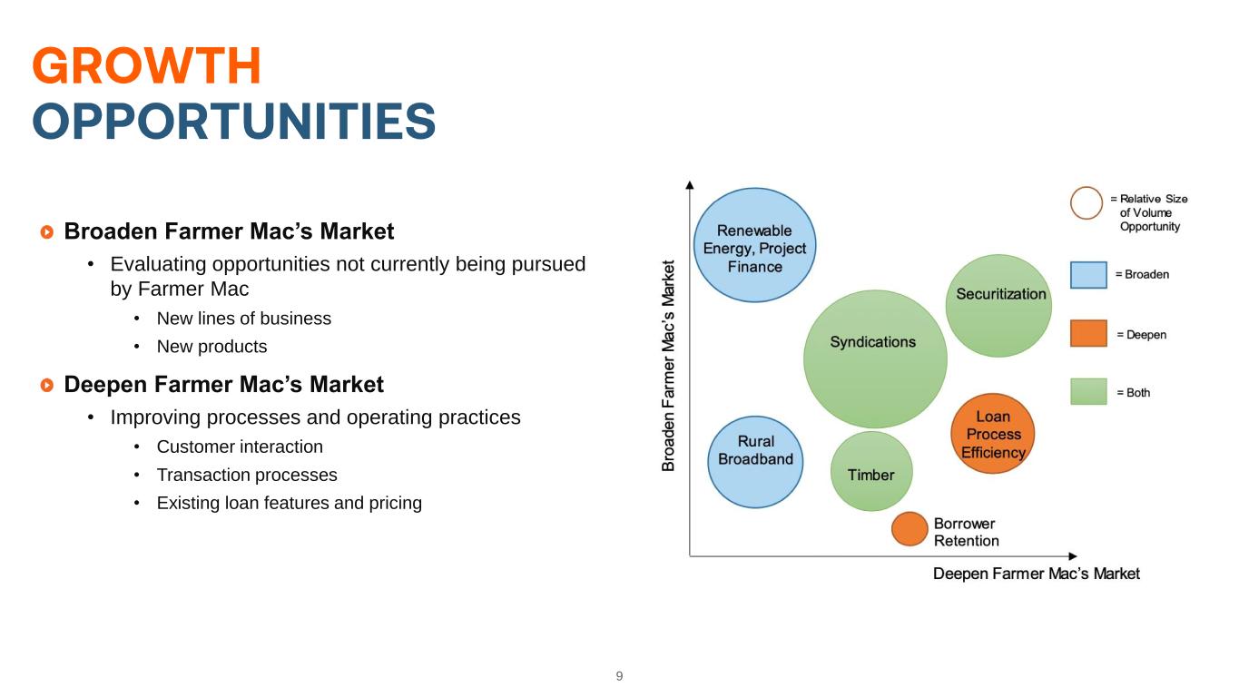 8 Farm Credit System (FCS) (Cooperative GSE) • Four FCS Banks • 69 Retail Agricultural Credit Associations Agricultural Mortgage Market (Farmers & Ranchers) (FCS Secondary Market GSE) Agricultural Finance Line of Business (Farm & Ranch and Corporate AgFinance) Non-FCS Ag Lenders • Insurance Companies • Ag Banks • Non-Bank Lenders Mortgage FinancingMortgage Financing (2)