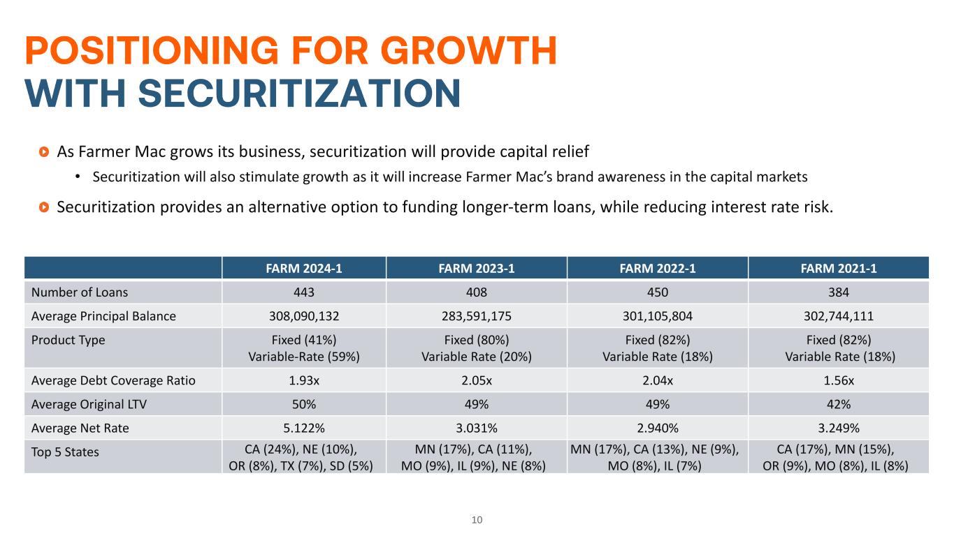 9 Broaden Farmer Mac’s Market • Evaluating opportunities not currently being pursued by Farmer Mac • New lines of business • New products Deepen Farmer Mac’s Market • Improving processes and operating practices • Customer interaction • Transaction processes • Existing loan features and pricing