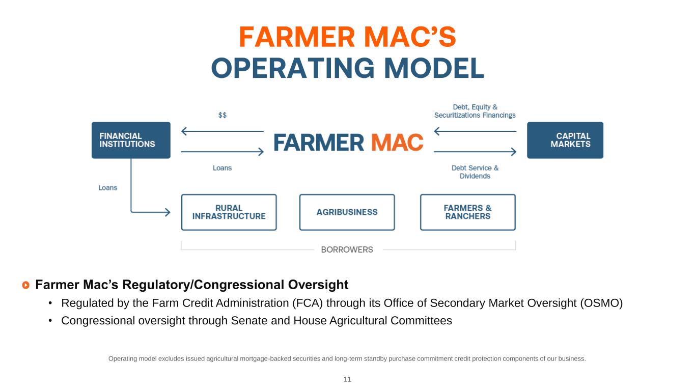 10 FARM 2024-1 FARM 2023-1 FARM 2022-1 FARM 2021-1 Number of Loans 443 408 450 384 Average Principal Balance 308,090,132 283,591,175 301,105,804 302,744,111 Product Type Fixed (41%) Variable-Rate (59%) Fixed (80%) Variable Rate (20%) Fixed (82%) Variable Rate (18%) Fixed (82%) Variable Rate (18%) Average Debt Coverage Ratio 1.93x 2.05x 2.04x 1.56x Average Original LTV 50% 49% 49% 42% Average Net Rate 5.122% 3.031% 2.940% 3.249% Top 5 States CA (24%), NE (10%), OR (8%), TX (7%), SD (5%) MN (17%), CA (11%), MO (9%), IL (9%), NE (8%) MN (17%), CA (13%), NE (9%), MO (8%), IL (7%) CA (17%), MN (15%), OR (9%), MO (8%), IL (8%) As Farmer Mac grows its business, securitization will provide capital relief • Securitization will also stimulate growth as it will increase Farmer Mac’s brand awareness in the capital markets Securitization provides an alternative option to funding longer-term loans, while reducing interest rate risk.