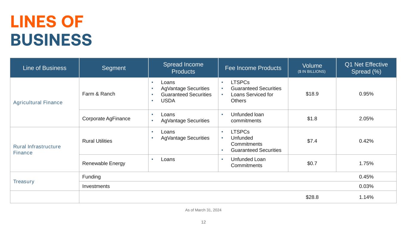 12 Line of Business Segment Spread Income Products Fee Income Products Volume ($ IN BILLIONS) Q1 Net Effective Spread (%) Agricultural Finance Farm & Ranch • Loans • AgVantage Securities • Guaranteed Securities • USDA • LTSPCs • Guaranteed Securities • Loans Serviced for Others $18.9 0.95% Corporate AgFinance • Loans • AgVantage Securities • Unfunded loan commitments $1.8 2.05% Rural Infrastructure Finance Rural Utilities • Loans • AgVantage Securities • LTSPCs • Unfunded Commitments • Guaranteed Securities $7.4 0.42% Renewable Energy • Loans • Unfunded Loan Commitments $0.7 1.75% Treasury Funding 0.45% Investments 0.03% $28.8 1.14% As of March 31, 2024