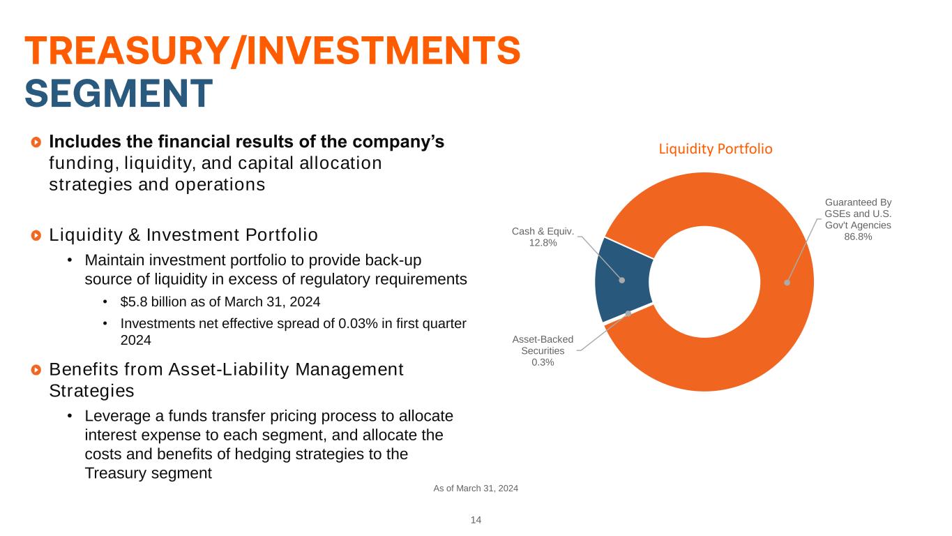 14 As of March 31, 2024 Includes the financial results of the company’s funding, liquidity, and capital allocation strategies and operations Liquidity & Investment Portfolio • Maintain investment portfolio to provide back-up source of liquidity in excess of regulatory requirements • $5.8 billion as of March 31, 2024 • Investments net effective spread of 0.03% in first quarter 2024 Benefits from Asset-Liability Management Strategies • Leverage a funds transfer pricing process to allocate interest expense to each segment, and allocate the costs and benefits of hedging strategies to the Treasury segment Cash & Equiv. 12.8% Guaranteed By GSEs and U.S. Gov't Agencies 86.8% Asset-Backed Securities 0.3% Liquidity Portfolio
