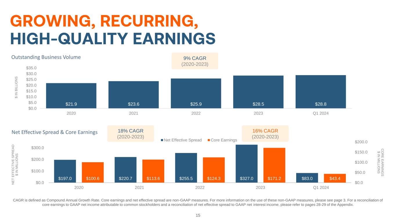 15 $21.9 $23.6 $25.9 $28.5 $28.8 $0.0 $5.0 $10.0 $15.0 $20.0 $25.0 $30.0 $35.0 2020 2021 2022 2023 Q1 2024 $ I N B IL L IO N S Outstanding Business Volume $197.0 $220.7 $255.5 $327.0 $83.0$100.6 $113.6 $124.3 $171.2 $43.4 $0.0 $50.0 $100.0 $150.0 $200.0 $0.0 $100.0 $200.0 $300.0 2020 2021 2022 2023 Q1 2024 C O R E E A R N IN G S $ IN M IL L IO N S N E T E F F E C T IV E S P R E A D $ I N M IL L IO N S Net Effective Spread & Core Earnings Net Effective Spread Core Earnings CAGR is defined as Compound Annual Growth Rate. Core earnings and net effective spread are non-GAAP measures. For more information on the use of these non-GAAP measures, please see page 3. For a reconciliation of core earnings to GAAP net income attributable to common stockholders and a reconciliation of net effective spread to GAAP net interest income, please refer to pages 28-29 of the Appendix. 18% CAGR (2020-2023) 16% CAGR (2020-2023) 9% CAGR (2020-2023)