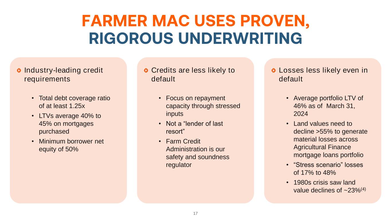 16 Strong earnings and consistent capital position support continued dividend growth for Farmer Mac. • Farmer Mac’s dividend growth rate over the past 13 years is substantially greater than those seen from the two major market indices. • 2024 marks the 13th consecutive year of higher annual dividends for Farmer Mac. • Farmer Mac is committed to strong returns and responsible growth. Dividend Yield1 13 Yr. Dividend CAGR Farmer Mac 2.84% 29.21% S&P 500 1.35% 8.98% Russell 2000 1.44% 10.13% $0.05 $0.10 $0.12 $0.14 $0.16 $0.26 $0.36 $0.58 $0.70 $0.80 $0.88 $0.95 $1.10 $1.40 $0.00 $0.20 $0.40 $0.60 $0.80 $1.00 $1.20 $1.40 $1.60 2011 2012 2013 2014 2015 2016 2017 2018 2019 2020 2021 2022 2023 2024 $ P E R S H A R E Quarterly Dividend per Common Share 27% year-over-year increase in 2024 Increased quarterly dividend payments for 13 consecutive years 1. Dividend yield data as of 3/31/2024