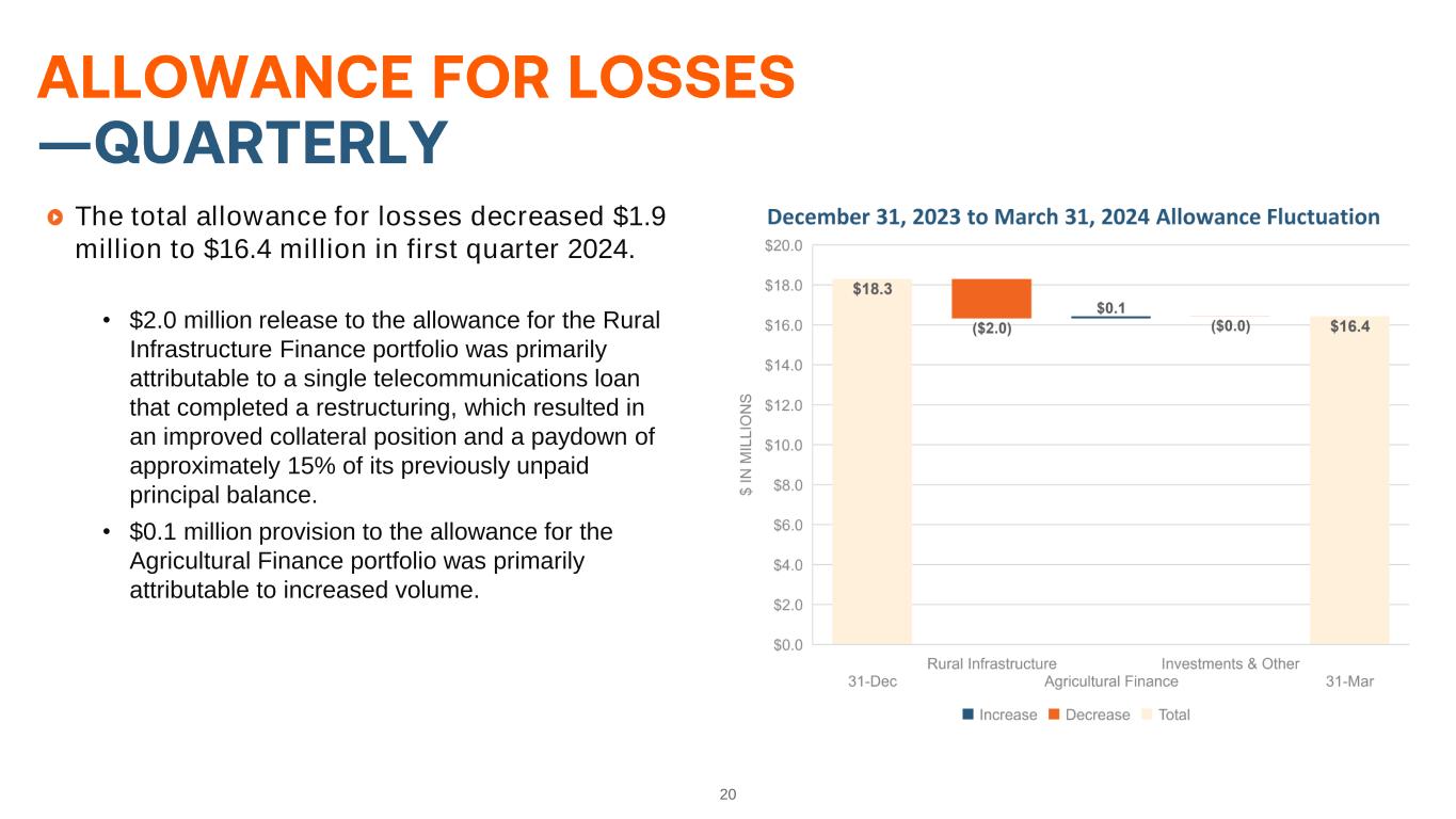 20 The total allowance for losses decreased $1.9 million to $16.4 million in first quarter 2024. • $2.0 million release to the allowance for the Rural Infrastructure Finance portfolio was primarily attributable to a single telecommunications loan that completed a restructuring, which resulted in an improved collateral position and a paydown of approximately 15% of its previously unpaid principal balance. • $0.1 million provision to the allowance for the Agricultural Finance portfolio was primarily attributable to increased volume.