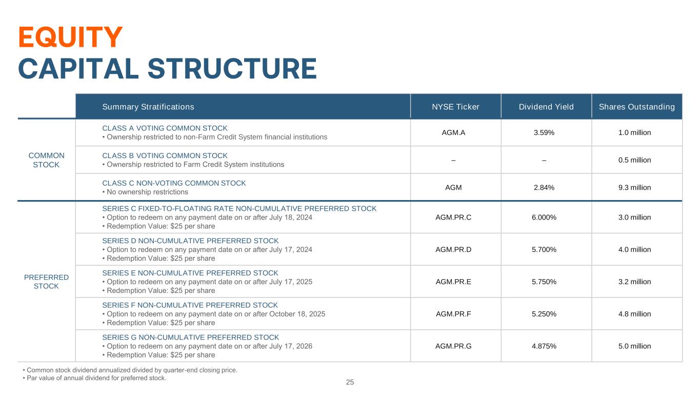 25 • Common stock dividend annualized divided by quarter-end closing price. • Par value of annual dividend for preferred stock. Summary Stratifications NYSE Ticker Dividend Yield Shares Outstanding COMMON STOCK CLASS A VOTING COMMON STOCK • Ownership restricted to non-Farm Credit System financial institutions AGM.A 3.59% 1.0 million CLASS B VOTING COMMON STOCK • Ownership restricted to Farm Credit System institutions – – 0.5 million CLASS C NON-VOTING COMMON STOCK • No ownership restrictions AGM 2.84% 9.3 million PREFERRED STOCK SERIES C FIXED-TO-FLOATING RATE NON-CUMULATIVE PREFERRED STOCK • Option to redeem on any payment date on or after July 18, 2024 • Redemption Value: $25 per share AGM.PR.C 6.000% 3.0 million SERIES D NON-CUMULATIVE PREFERRED STOCK • Option to redeem on any payment date on or after July 17, 2024 • Redemption Value: $25 per share AGM.PR.D 5.700% 4.0 million SERIES E NON-CUMULATIVE PREFERRED STOCK • Option to redeem on any payment date on or after July 17, 2025 • Redemption Value: $25 per share AGM.PR.E 5.750% 3.2 million SERIES F NON-CUMULATIVE PREFERRED STOCK • Option to redeem on any payment date on or after October 18, 2025 • Redemption Value: $25 per share AGM.PR.F 5.250% 4.8 million SERIES G NON-CUMULATIVE PREFERRED STOCK • Option to redeem on any payment date on or after July 17, 2026 • Redemption Value: $25 per share AGM.PR.G 4.875% 5.0 million