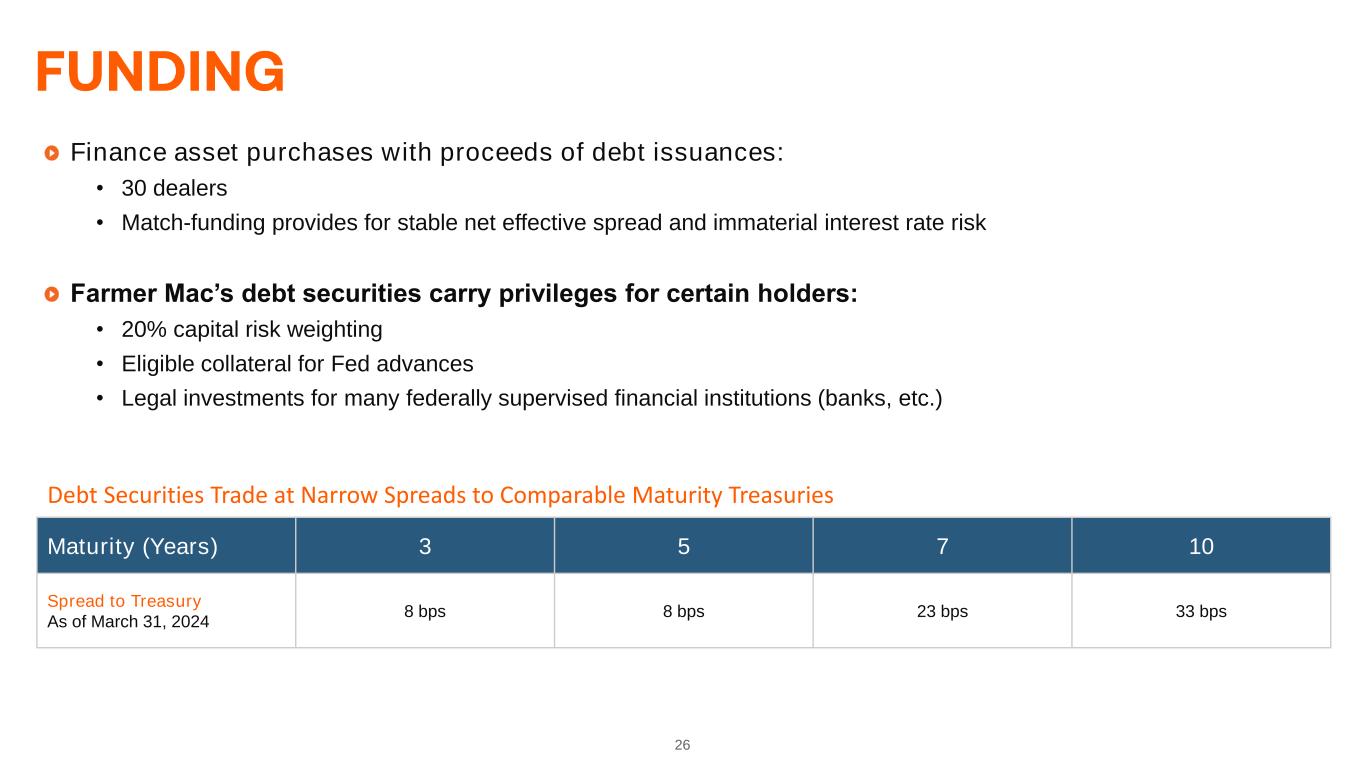 26 Finance asset purchases with proceeds of debt issuances: • 30 dealers • Match-funding provides for stable net effective spread and immaterial interest rate risk Farmer Mac’s debt securities carry privileges for certain holders: • 20% capital risk weighting • Eligible collateral for Fed advances • Legal investments for many federally supervised financial institutions (banks, etc.) Debt Securities Trade at Narrow Spreads to Comparable Maturity Treasuries Maturity (Years) 3 5 7 10 Spread to Treasury As of March 31, 2024 8 bps 8 bps 23 bps 33 bps
