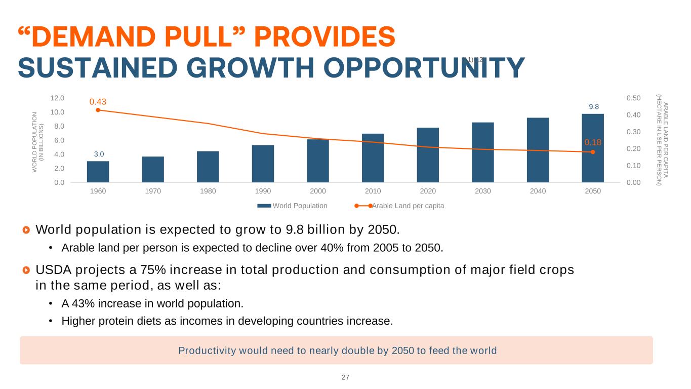 27 (11)(12) World population is expected to grow to 9.8 billion by 2050. • Arable land per person is expected to decline over 40% from 2005 to 2050. USDA projects a 75% increase in total production and consumption of major field crops in the same period, as well as: • A 43% increase in world population. • Higher protein diets as incomes in developing countries increase. Productivity would need to nearly double by 2050 to feed the world 3.0 9.8 0.43 0.18 0.00 0.10 0.20 0.30 0.40 0.50 0.0 2.0 4.0 6.0 8.0 10.0 12.0 1960 1970 1980 1990 2000 2010 2020 2030 2040 2050 A R A B L E L A N D P E R C A P IT A (H E C T A R E IN U S E P E R P E R S O N ) W O R L D P O P U L A T IO N (I N B IL L IO N S ) World Population Arable Land per capita