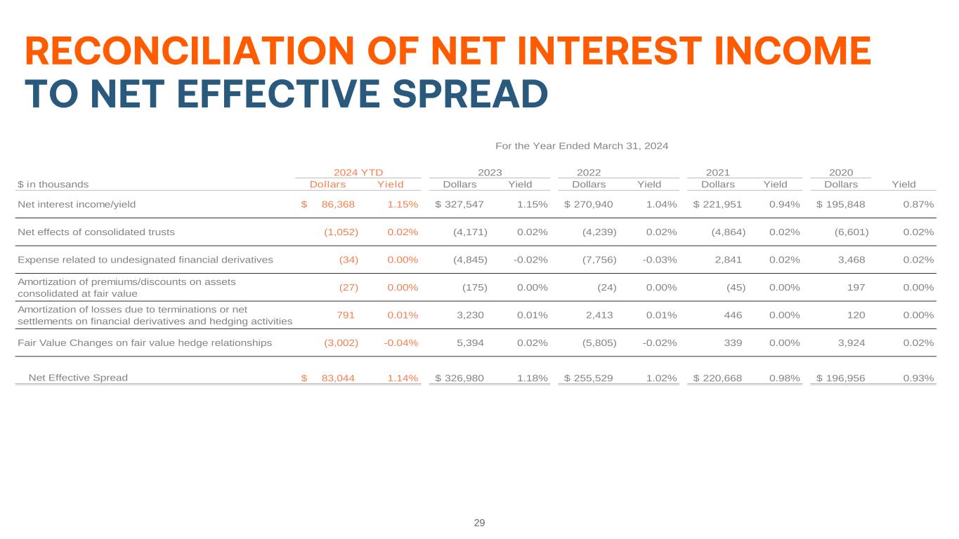 29 2022 2021 2020 $ in thousands Dollars Yield Dollars Yield Dollars Yield Dollars Yield Dollars Yield Net interest income/yield 86,368$ 1.15% 327,547$ 1.15% 270,940$ 1.04% 221,951$ 0.94% 195,848$ 0.87% Net effects of consolidated trusts (1,052) 0.02% (4,171) 0.02% (4,239) 0.02% (4,864) 0.02% (6,601) 0.02% Expense related to undesignated financial derivatives (34) 0.00% (4,845) -0.02% (7,756) -0.03% 2,841 0.02% 3,468 0.02% Amortization of premiums/discounts on assets consolidated at fair value (27) 0.00% (175) 0.00% (24) 0.00% (45) 0.00% 197 0.00% Amortization of losses due to terminations or net settlements on financial derivatives and hedging activities 791 0.01% 3,230 0.01% 2,413 0.01% 446 0.00% 120 0.00% Fair Value Changes on fair value hedge relationships (3,002) -0.04% 5,394 0.02% (5,805) -0.02% 339 0.00% 3,924 0.02% Net Effective Spread 83,044$ 1.14% 326,980$ 1.18% 255,529$ 1.02% 220,668$ 0.98% 196,956$ 0.93% 2024 YTD For the Year Ended March 31, 2024 2023