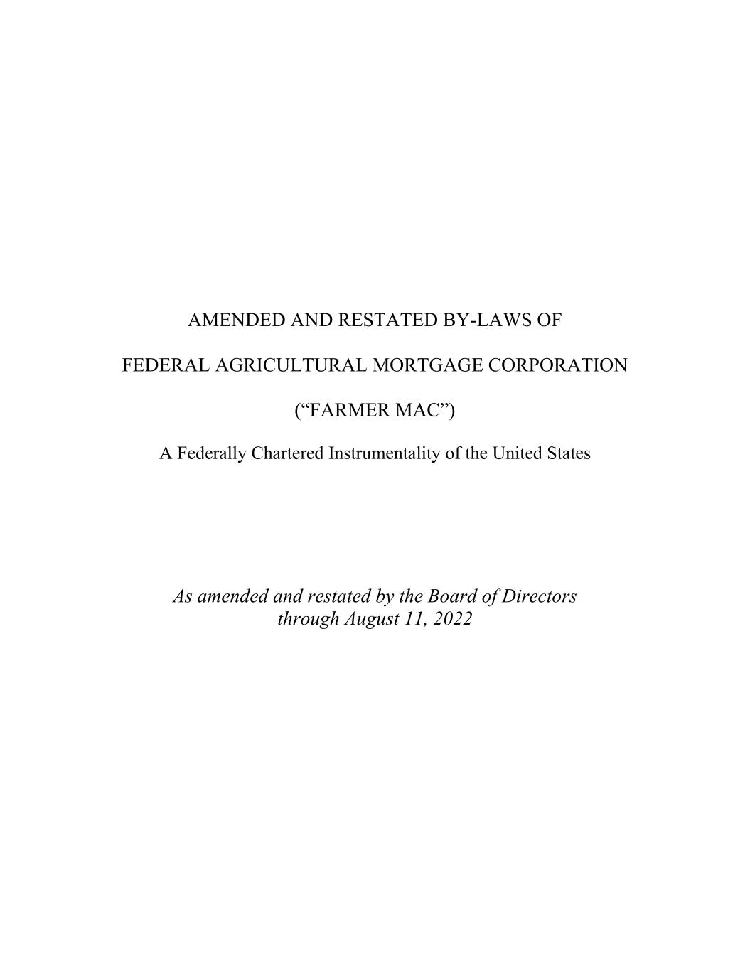 AMENDED AND RESTATED BY-LAWS OF FEDERAL AGRICULTURAL MORTGAGE CORPORATION (“FARMER MAC”) A Federally Chartered Instrumentality of the United States As amended and restated by the Board of Directors through August 11, 2022