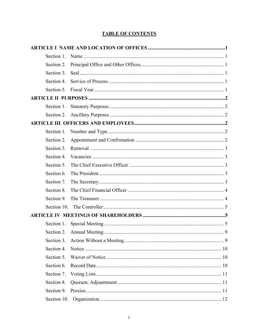 i TABLE OF CONTENTS ARTICLE I NAME AND LOCATION OF OFFICES .............................................................1 Section 1. Name ............................................................................................................... 1 Section 2. Principal Office and Other Offices.................................................................. 1 Section 3. Seal .................................................................................................................. 1 Section 4. Service of Process ........................................................................................... 1 Section 5. Fiscal Year....................................................................................................... 1 ARTICLE II PURPOSES ............................................................................................................2 Section 1. Statutory Purposes ........................................................................................... 2 Section 2. Ancillary Purposes .......................................................................................... 2 ARTICLE III OFFICERS AND EMPLOYEES ........................................................................2 Section 1. Number and Type ............................................................................................ 2 Section 2. Appointment and Confirmation ...................................................................... 2 Section 3. Removal .......................................................................................................... 3 Section 4. Vacancies ........................................................................................................ 3 Section 5. The Chief Executive Officer ........................................................................... 3 Section 6. The President ................................................................................................... 3 Section 7. The Secretary................................................................................................... 3 Section 8. The Chief Financial Officer ............................................................................ 4 Section 9. The Treasurer .................................................................................................. 4 Section 10. The Controller ............................................................................................... 5 ARTICLE IV MEETINGS OF SHAREHOLDERS .................................................................5 Section 1. Special Meeting ............................................................................................... 5 Section 2. Annual Meeting ............................................................................................... 9 Section 3. Action Without a Meeting ............................................................................... 9 Section 4. Notice ............................................................................................................ 10 Section 5. Waiver of Notice ........................................................................................... 10 Section 6. Record Date ................................................................................................... 10 Section 7. Voting Lists ................................................................................................... 11 Section 8. Quorum; Adjournment .................................................................................. 11 Section 9. Proxies ........................................................................................................... 11 Section 10. Organization ................................................................................................ 12