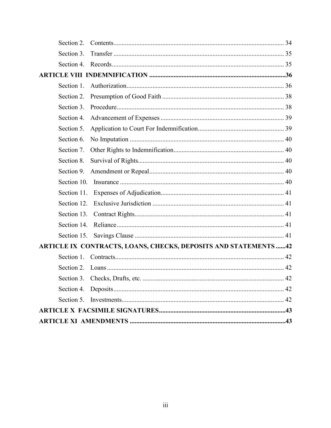 iii Section 2. Contents ......................................................................................................... 34 Section 3. Transfer ......................................................................................................... 35 Section 4. Records .......................................................................................................... 35 ARTICLE VIII INDEMNIFICATION ....................................................................................36 Section 1. Authorization ................................................................................................. 36 Section 2. Presumption of Good Faith ........................................................................... 38 Section 3. Procedure ....................................................................................................... 38 Section 4. Advancement of Expenses ............................................................................ 39 Section 5. Application to Court For Indemnification ..................................................... 39 Section 6. No Imputation ............................................................................................... 40 Section 7. Other Rights to Indemnification .................................................................... 40 Section 8. Survival of Rights.......................................................................................... 40 Section 9. Amendment or Repeal ................................................................................... 40 Section 10. Insurance ..................................................................................................... 40 Section 11. Expenses of Adjudication............................................................................ 41 Section 12. Exclusive Jurisdiction ................................................................................. 41 Section 13. Contract Rights ............................................................................................ 41 Section 14. Reliance ....................................................................................................... 41 Section 15. Savings Clause ............................................................................................ 41 ARTICLE IX CONTRACTS, LOANS, CHECKS, DEPOSITS AND STATEMENTS ......42 Section 1. Contracts........................................................................................................ 42 Section 2. Loans ............................................................................................................. 42 Section 3. Checks, Drafts, etc. ....................................................................................... 42 Section 4. Deposits ......................................................................................................... 42 Section 5. Investments.................................................................................................... 42 ARTICLE X FACSIMILE SIGNATURES ..............................................................................43 ARTICLE XI AMENDMENTS ................................................................................................43