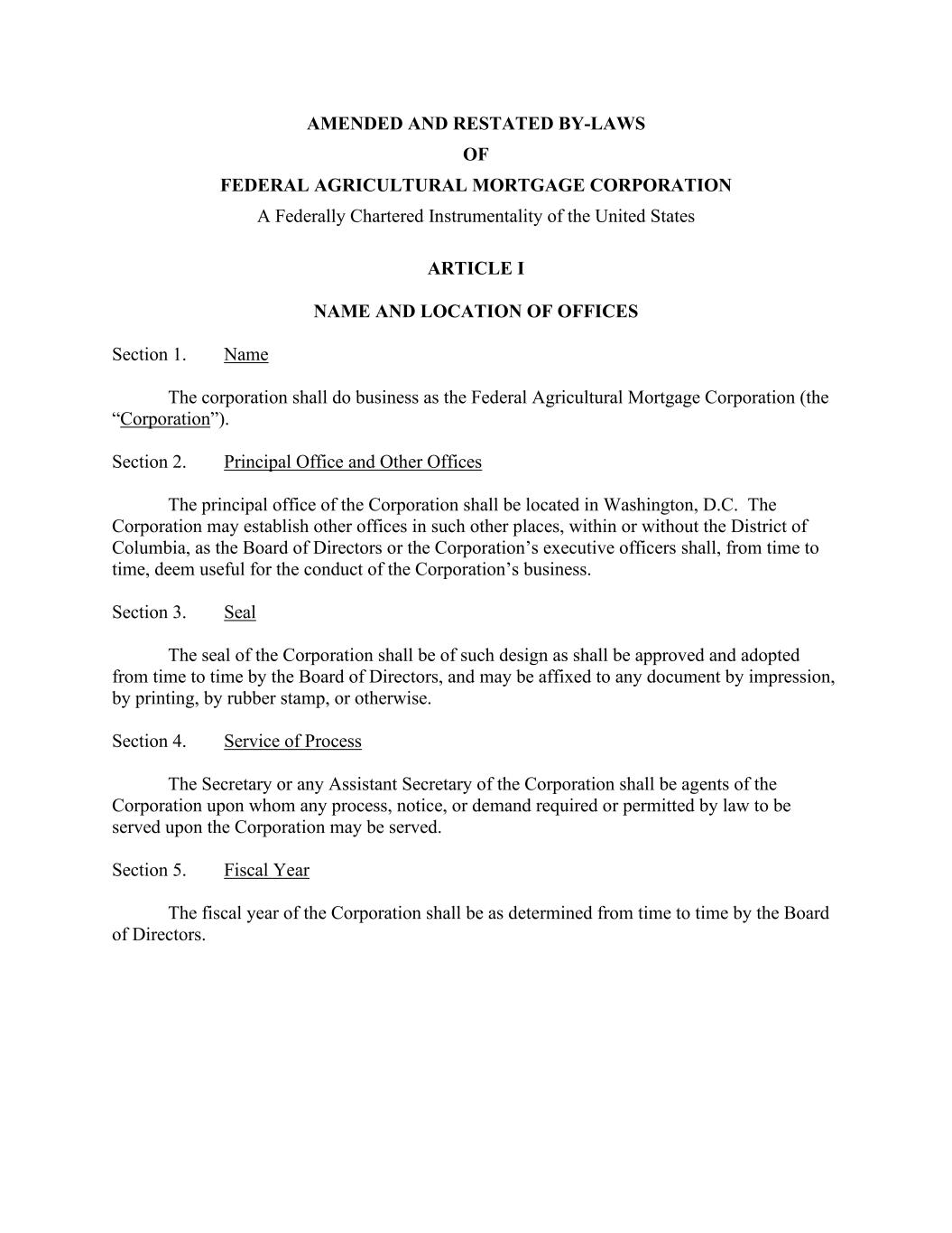 AMENDED AND RESTATED BY-LAWS OF FEDERAL AGRICULTURAL MORTGAGE CORPORATION A Federally Chartered Instrumentality of the United States ARTICLE I NAME AND LOCATION OF OFFICES Section 1. Name The corporation shall do business as the Federal Agricultural Mortgage Corporation (the “Corporation”). Section 2. Principal Office and Other Offices The principal office of the Corporation shall be located in Washington, D.C. The Corporation may establish other offices in such other places, within or without the District of Columbia, as the Board of Directors or the Corporation’s executive officers shall, from time to time, deem useful for the conduct of the Corporation’s business. Section 3. Seal The seal of the Corporation shall be of such design as shall be approved and adopted from time to time by the Board of Directors, and may be affixed to any document by impression, by printing, by rubber stamp, or otherwise. Section 4. Service of Process The Secretary or any Assistant Secretary of the Corporation shall be agents of the Corporation upon whom any process, notice, or demand required or permitted by law to be served upon the Corporation may be served. Section 5. Fiscal Year The fiscal year of the Corporation shall be as determined from time to time by the Board of Directors.