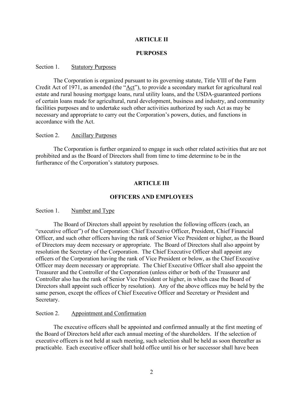 2 ARTICLE II PURPOSES Section 1. Statutory Purposes The Corporation is organized pursuant to its governing statute, Title VIII of the Farm Credit Act of 1971, as amended (the “Act”), to provide a secondary market for agricultural real estate and rural housing mortgage loans, rural utility loans, and the USDA-guaranteed portions of certain loans made for agricultural, rural development, business and industry, and community facilities purposes and to undertake such other activities authorized by such Act as may be necessary and appropriate to carry out the Corporation’s powers, duties, and functions in accordance with the Act. Section 2. Ancillary Purposes The Corporation is further organized to engage in such other related activities that are not prohibited and as the Board of Directors shall from time to time determine to be in the furtherance of the Corporation’s statutory purposes. ARTICLE III OFFICERS AND EMPLOYEES Section 1. Number and Type The Board of Directors shall appoint by resolution the following officers (each, an “executive officer”) of the Corporation: Chief Executive Officer, President, Chief Financial Officer, and such other officers having the rank of Senior Vice President or higher, as the Board of Directors may deem necessary or appropriate. The Board of Directors shall also appoint by resolution the Secretary of the Corporation. The Chief Executive Officer shall appoint any officers of the Corporation having the rank of Vice President or below, as the Chief Executive Officer may deem necessary or appropriate. The Chief Executive Officer shall also appoint the Treasurer and the Controller of the Corporation (unless either or both of the Treasurer and Controller also has the rank of Senior Vice President or higher, in which case the Board of Directors shall appoint such officer by resolution). Any of the above offices may be held by the same person, except the offices of Chief Executive Officer and Secretary or President and Secretary. Section 2. Appointment and Confirmation The executive officers shall be appointed and confirmed annually at the first meeting of the Board of Directors held after each annual meeting of the shareholders. If the selection of executive officers is not held at such meeting, such selection shall be held as soon thereafter as practicable. Each executive officer shall hold office until his or her successor shall have been