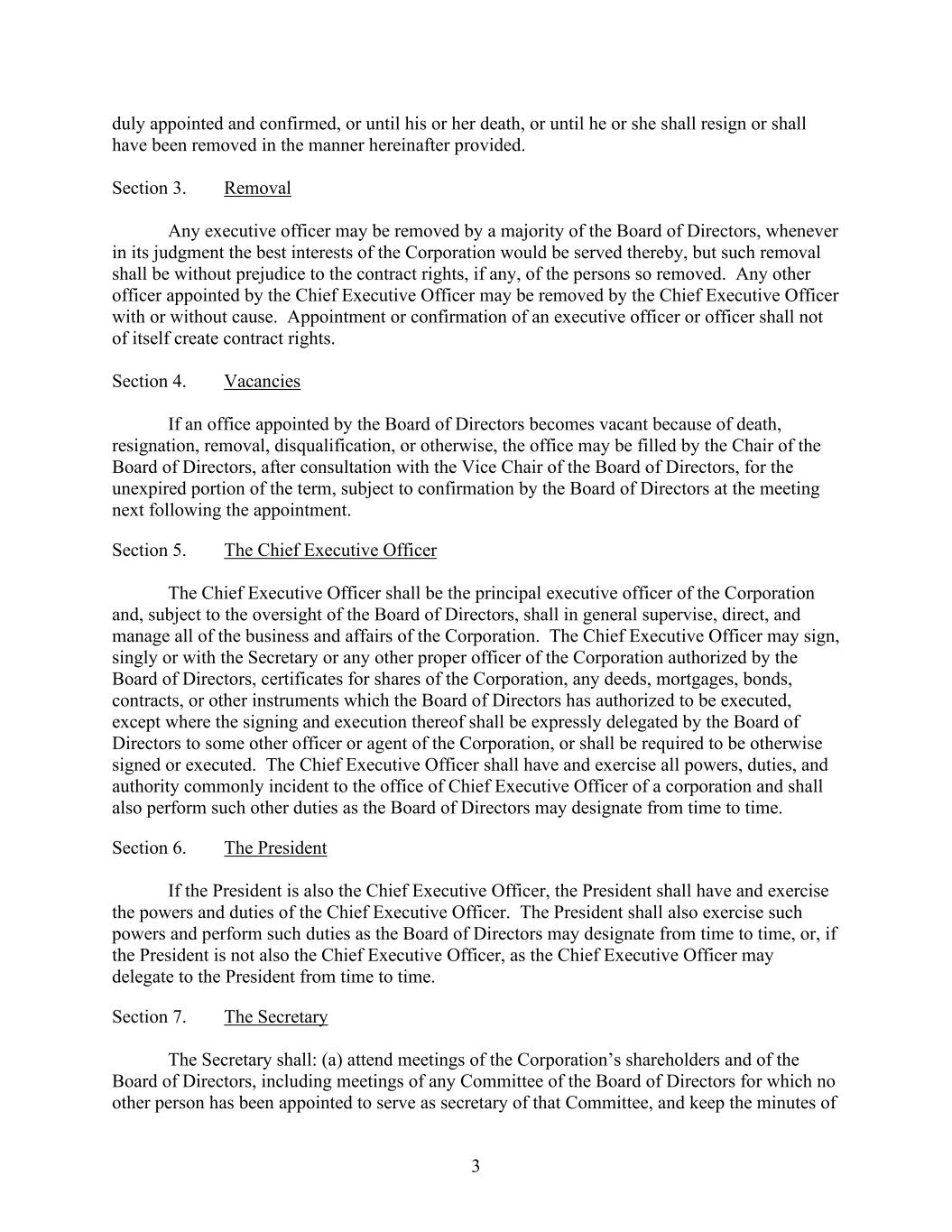 3 duly appointed and confirmed, or until his or her death, or until he or she shall resign or shall have been removed in the manner hereinafter provided. Section 3. Removal Any executive officer may be removed by a majority of the Board of Directors, whenever in its judgment the best interests of the Corporation would be served thereby, but such removal shall be without prejudice to the contract rights, if any, of the persons so removed. Any other officer appointed by the Chief Executive Officer may be removed by the Chief Executive Officer with or without cause. Appointment or confirmation of an executive officer or officer shall not of itself create contract rights. Section 4. Vacancies If an office appointed by the Board of Directors becomes vacant because of death, resignation, removal, disqualification, or otherwise, the office may be filled by the Chair of the Board of Directors, after consultation with the Vice Chair of the Board of Directors, for the unexpired portion of the term, subject to confirmation by the Board of Directors at the meeting next following the appointment. Section 5. The Chief Executive Officer The Chief Executive Officer shall be the principal executive officer of the Corporation and, subject to the oversight of the Board of Directors, shall in general supervise, direct, and manage all of the business and affairs of the Corporation. The Chief Executive Officer may sign, singly or with the Secretary or any other proper officer of the Corporation authorized by the Board of Directors, certificates for shares of the Corporation, any deeds, mortgages, bonds, contracts, or other instruments which the Board of Directors has authorized to be executed, except where the signing and execution thereof shall be expressly delegated by the Board of Directors to some other officer or agent of the Corporation, or shall be required to be otherwise signed or executed. The Chief Executive Officer shall have and exercise all powers, duties, and authority commonly incident to the office of Chief Executive Officer of a corporation and shall also perform such other duties as the Board of Directors may designate from time to time. Section 6. The President If the President is also the Chief Executive Officer, the President shall have and exercise the powers and duties of the Chief Executive Officer. The President shall also exercise such powers and perform such duties as the Board of Directors may designate from time to time, or, if the President is not also the Chief Executive Officer, as the Chief Executive Officer may delegate to the President from time to time. Section 7. The Secretary The Secretary shall: (a) attend meetings of the Corporation’s shareholders and of the Board of Directors, including meetings of any Committee of the Board of Directors for which no other person has been appointed to serve as secretary of that Committee, and keep the minutes of