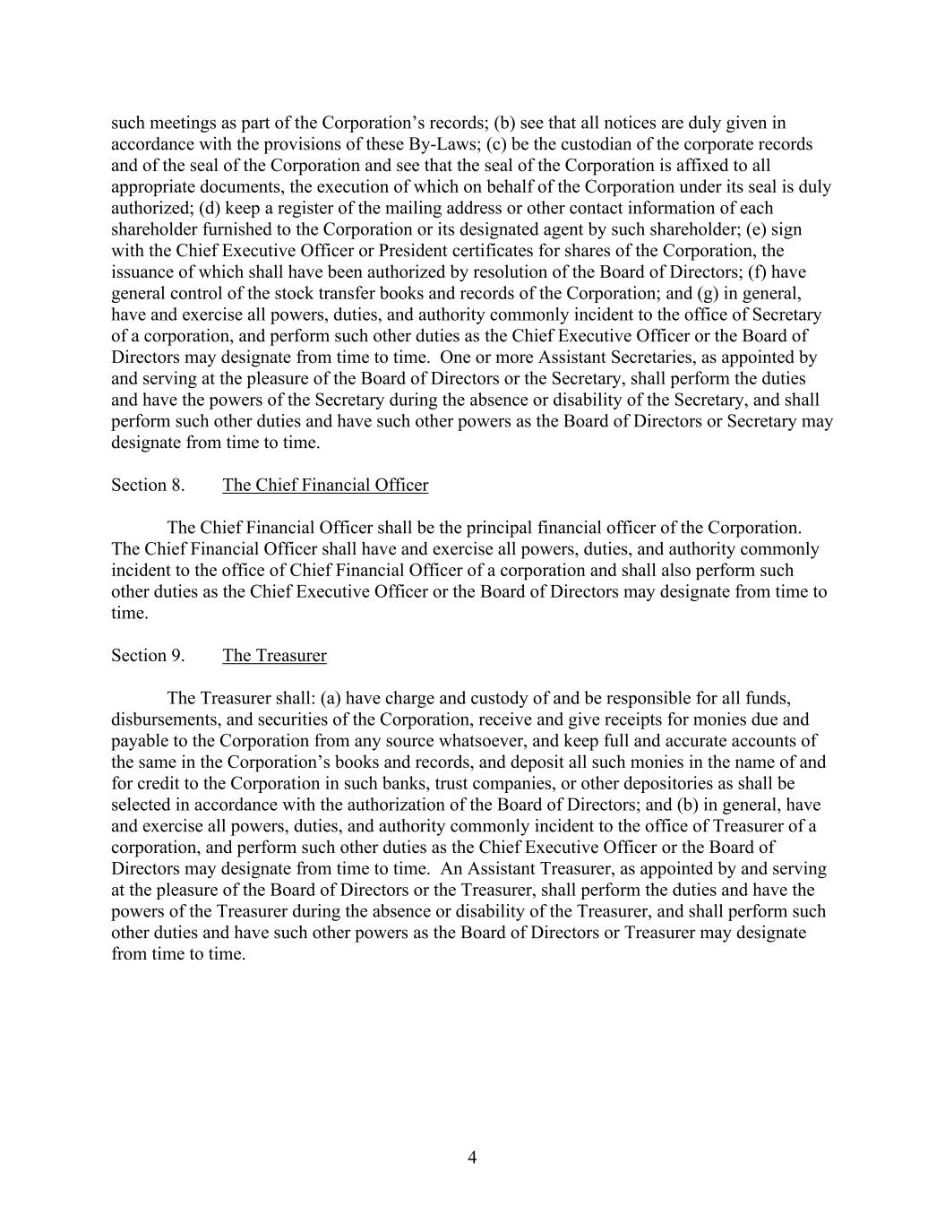 4 such meetings as part of the Corporation’s records; (b) see that all notices are duly given in accordance with the provisions of these By-Laws; (c) be the custodian of the corporate records and of the seal of the Corporation and see that the seal of the Corporation is affixed to all appropriate documents, the execution of which on behalf of the Corporation under its seal is duly authorized; (d) keep a register of the mailing address or other contact information of each shareholder furnished to the Corporation or its designated agent by such shareholder; (e) sign with the Chief Executive Officer or President certificates for shares of the Corporation, the issuance of which shall have been authorized by resolution of the Board of Directors; (f) have general control of the stock transfer books and records of the Corporation; and (g) in general, have and exercise all powers, duties, and authority commonly incident to the office of Secretary of a corporation, and perform such other duties as the Chief Executive Officer or the Board of Directors may designate from time to time. One or more Assistant Secretaries, as appointed by and serving at the pleasure of the Board of Directors or the Secretary, shall perform the duties and have the powers of the Secretary during the absence or disability of the Secretary, and shall perform such other duties and have such other powers as the Board of Directors or Secretary may designate from time to time. Section 8. The Chief Financial Officer The Chief Financial Officer shall be the principal financial officer of the Corporation. The Chief Financial Officer shall have and exercise all powers, duties, and authority commonly incident to the office of Chief Financial Officer of a corporation and shall also perform such other duties as the Chief Executive Officer or the Board of Directors may designate from time to time. Section 9. The Treasurer The Treasurer shall: (a) have charge and custody of and be responsible for all funds, disbursements, and securities of the Corporation, receive and give receipts for monies due and payable to the Corporation from any source whatsoever, and keep full and accurate accounts of the same in the Corporation’s books and records, and deposit all such monies in the name of and for credit to the Corporation in such banks, trust companies, or other depositories as shall be selected in accordance with the authorization of the Board of Directors; and (b) in general, have and exercise all powers, duties, and authority commonly incident to the office of Treasurer of a corporation, and perform such other duties as the Chief Executive Officer or the Board of Directors may designate from time to time. An Assistant Treasurer, as appointed by and serving at the pleasure of the Board of Directors or the Treasurer, shall perform the duties and have the powers of the Treasurer during the absence or disability of the Treasurer, and shall perform such other duties and have such other powers as the Board of Directors or Treasurer may designate from time to time.