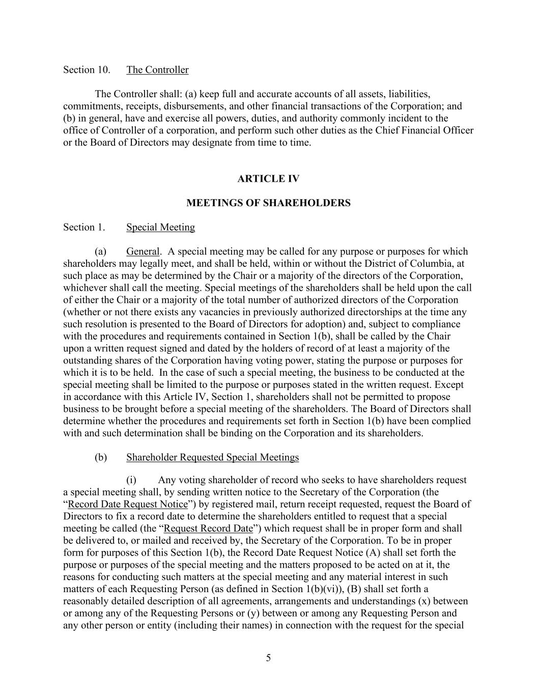5 Section 10. The Controller The Controller shall: (a) keep full and accurate accounts of all assets, liabilities, commitments, receipts, disbursements, and other financial transactions of the Corporation; and (b) in general, have and exercise all powers, duties, and authority commonly incident to the office of Controller of a corporation, and perform such other duties as the Chief Financial Officer or the Board of Directors may designate from time to time. ARTICLE IV MEETINGS OF SHAREHOLDERS Section 1. Special Meeting (a) General. A special meeting may be called for any purpose or purposes for which shareholders may legally meet, and shall be held, within or without the District of Columbia, at such place as may be determined by the Chair or a majority of the directors of the Corporation, whichever shall call the meeting. Special meetings of the shareholders shall be held upon the call of either the Chair or a majority of the total number of authorized directors of the Corporation (whether or not there exists any vacancies in previously authorized directorships at the time any such resolution is presented to the Board of Directors for adoption) and, subject to compliance with the procedures and requirements contained in Section 1(b), shall be called by the Chair upon a written request signed and dated by the holders of record of at least a majority of the outstanding shares of the Corporation having voting power, stating the purpose or purposes for which it is to be held. In the case of such a special meeting, the business to be conducted at the special meeting shall be limited to the purpose or purposes stated in the written request. Except in accordance with this Article IV, Section 1, shareholders shall not be permitted to propose business to be brought before a special meeting of the shareholders. The Board of Directors shall determine whether the procedures and requirements set forth in Section 1(b) have been complied with and such determination shall be binding on the Corporation and its shareholders. (b) Shareholder Requested Special Meetings (i) Any voting shareholder of record who seeks to have shareholders request a special meeting shall, by sending written notice to the Secretary of the Corporation (the “Record Date Request Notice”) by registered mail, return receipt requested, request the Board of Directors to fix a record date to determine the shareholders entitled to request that a special meeting be called (the “Request Record Date”) which request shall be in proper form and shall be delivered to, or mailed and received by, the Secretary of the Corporation. To be in proper form for purposes of this Section 1(b), the Record Date Request Notice (A) shall set forth the purpose or purposes of the special meeting and the matters proposed to be acted on at it, the reasons for conducting such matters at the special meeting and any material interest in such matters of each Requesting Person (as defined in Section 1(b)(vi)), (B) shall set forth a reasonably detailed description of all agreements, arrangements and understandings (x) between or among any of the Requesting Persons or (y) between or among any Requesting Person and any other person or entity (including their names) in connection with the request for the special