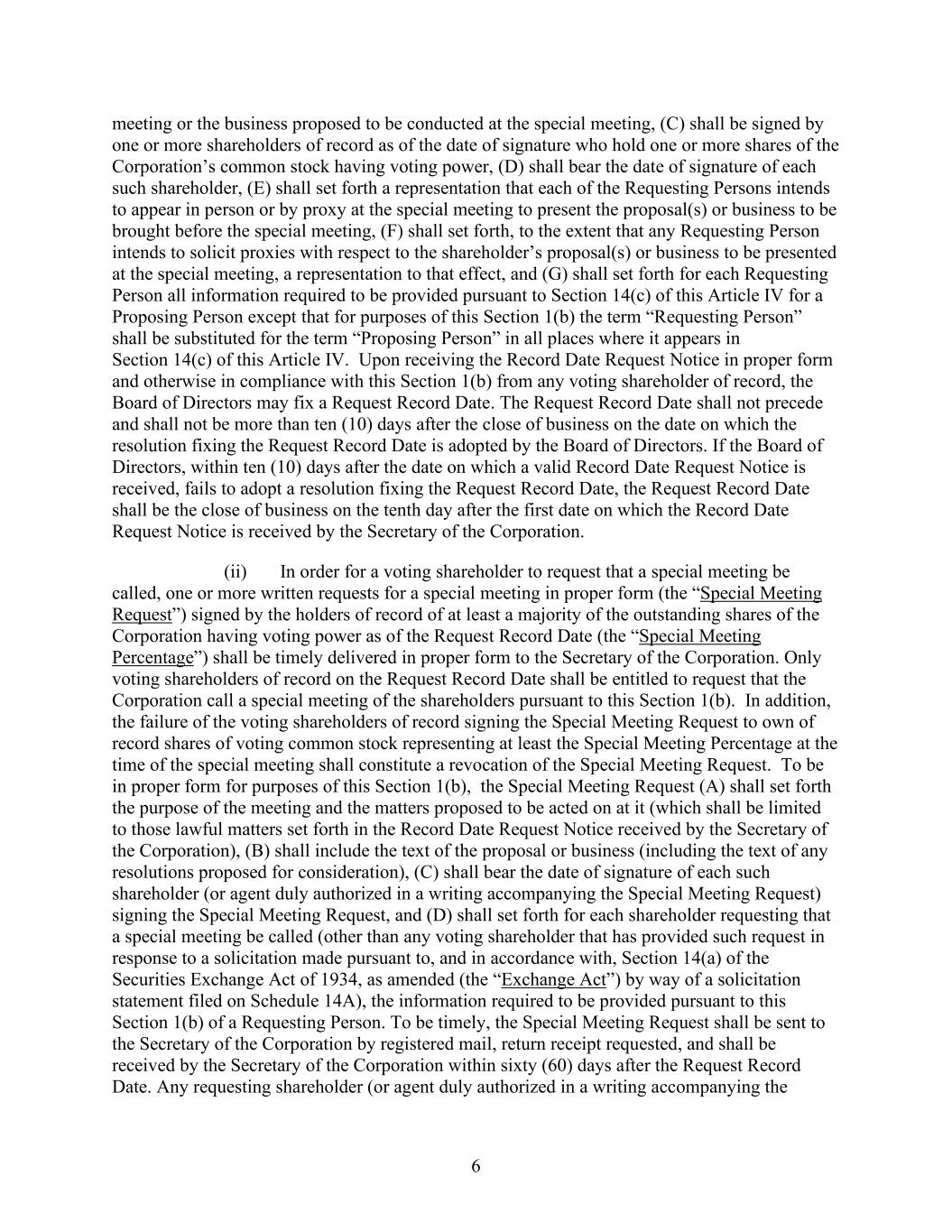 6 meeting or the business proposed to be conducted at the special meeting, (C) shall be signed by one or more shareholders of record as of the date of signature who hold one or more shares of the Corporation’s common stock having voting power, (D) shall bear the date of signature of each such shareholder, (E) shall set forth a representation that each of the Requesting Persons intends to appear in person or by proxy at the special meeting to present the proposal(s) or business to be brought before the special meeting, (F) shall set forth, to the extent that any Requesting Person intends to solicit proxies with respect to the shareholder’s proposal(s) or business to be presented at the special meeting, a representation to that effect, and (G) shall set forth for each Requesting Person all information required to be provided pursuant to Section 14(c) of this Article IV for a Proposing Person except that for purposes of this Section 1(b) the term “Requesting Person” shall be substituted for the term “Proposing Person” in all places where it appears in Section 14(c) of this Article IV. Upon receiving the Record Date Request Notice in proper form and otherwise in compliance with this Section 1(b) from any voting shareholder of record, the Board of Directors may fix a Request Record Date. The Request Record Date shall not precede and shall not be more than ten (10) days after the close of business on the date on which the resolution fixing the Request Record Date is adopted by the Board of Directors. If the Board of Directors, within ten (10) days after the date on which a valid Record Date Request Notice is received, fails to adopt a resolution fixing the Request Record Date, the Request Record Date shall be the close of business on the tenth day after the first date on which the Record Date Request Notice is received by the Secretary of the Corporation. (ii) In order for a voting shareholder to request that a special meeting be called, one or more written requests for a special meeting in proper form (the “Special Meeting Request”) signed by the holders of record of at least a majority of the outstanding shares of the Corporation having voting power as of the Request Record Date (the “Special Meeting Percentage”) shall be timely delivered in proper form to the Secretary of the Corporation. Only voting shareholders of record on the Request Record Date shall be entitled to request that the Corporation call a special meeting of the shareholders pursuant to this Section 1(b). In addition, the failure of the voting shareholders of record signing the Special Meeting Request to own of record shares of voting common stock representing at least the Special Meeting Percentage at the time of the special meeting shall constitute a revocation of the Special Meeting Request. To be in proper form for purposes of this Section 1(b), the Special Meeting Request (A) shall set forth the purpose of the meeting and the matters proposed to be acted on at it (which shall be limited to those lawful matters set forth in the Record Date Request Notice received by the Secretary of the Corporation), (B) shall include the text of the proposal or business (including the text of any resolutions proposed for consideration), (C) shall bear the date of signature of each such shareholder (or agent duly authorized in a writing accompanying the Special Meeting Request) signing the Special Meeting Request, and (D) shall set forth for each shareholder requesting that a special meeting be called (other than any voting shareholder that has provided such request in response to a solicitation made pursuant to, and in accordance with, Section 14(a) of the Securities Exchange Act of 1934, as amended (the “Exchange Act”) by way of a solicitation statement filed on Schedule 14A), the information required to be provided pursuant to this Section 1(b) of a Requesting Person. To be timely, the Special Meeting Request shall be sent to the Secretary of the Corporation by registered mail, return receipt requested, and shall be received by the Secretary of the Corporation within sixty (60) days after the Request Record Date. Any requesting shareholder (or agent duly authorized in a writing accompanying the