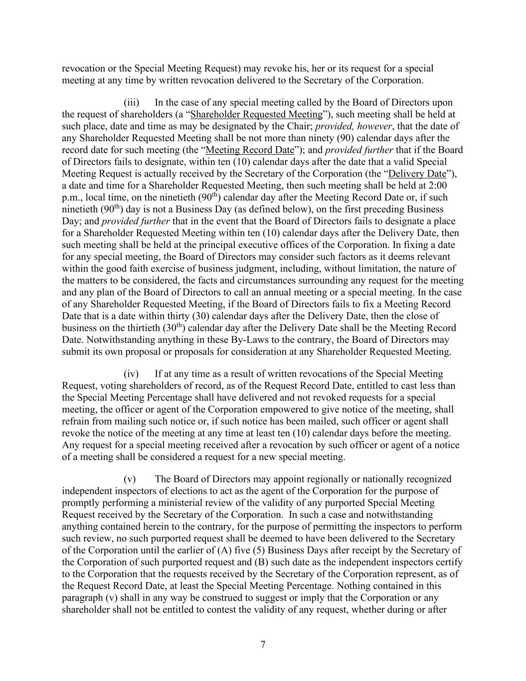 7 revocation or the Special Meeting Request) may revoke his, her or its request for a special meeting at any time by written revocation delivered to the Secretary of the Corporation. (iii) In the case of any special meeting called by the Board of Directors upon the request of shareholders (a “Shareholder Requested Meeting”), such meeting shall be held at such place, date and time as may be designated by the Chair; provided, however, that the date of any Shareholder Requested Meeting shall be not more than ninety (90) calendar days after the record date for such meeting (the “Meeting Record Date”); and provided further that if the Board of Directors fails to designate, within ten (10) calendar days after the date that a valid Special Meeting Request is actually received by the Secretary of the Corporation (the “Delivery Date”), a date and time for a Shareholder Requested Meeting, then such meeting shall be held at 2:00 p.m., local time, on the ninetieth (90th) calendar day after the Meeting Record Date or, if such ninetieth (90th) day is not a Business Day (as defined below), on the first preceding Business Day; and provided further that in the event that the Board of Directors fails to designate a place for a Shareholder Requested Meeting within ten (10) calendar days after the Delivery Date, then such meeting shall be held at the principal executive offices of the Corporation. In fixing a date for any special meeting, the Board of Directors may consider such factors as it deems relevant within the good faith exercise of business judgment, including, without limitation, the nature of the matters to be considered, the facts and circumstances surrounding any request for the meeting and any plan of the Board of Directors to call an annual meeting or a special meeting. In the case of any Shareholder Requested Meeting, if the Board of Directors fails to fix a Meeting Record Date that is a date within thirty (30) calendar days after the Delivery Date, then the close of business on the thirtieth (30th) calendar day after the Delivery Date shall be the Meeting Record Date. Notwithstanding anything in these By-Laws to the contrary, the Board of Directors may submit its own proposal or proposals for consideration at any Shareholder Requested Meeting. (iv) If at any time as a result of written revocations of the Special Meeting Request, voting shareholders of record, as of the Request Record Date, entitled to cast less than the Special Meeting Percentage shall have delivered and not revoked requests for a special meeting, the officer or agent of the Corporation empowered to give notice of the meeting, shall refrain from mailing such notice or, if such notice has been mailed, such officer or agent shall revoke the notice of the meeting at any time at least ten (10) calendar days before the meeting. Any request for a special meeting received after a revocation by such officer or agent of a notice of a meeting shall be considered a request for a new special meeting. (v) The Board of Directors may appoint regionally or nationally recognized independent inspectors of elections to act as the agent of the Corporation for the purpose of promptly performing a ministerial review of the validity of any purported Special Meeting Request received by the Secretary of the Corporation. In such a case and notwithstanding anything contained herein to the contrary, for the purpose of permitting the inspectors to perform such review, no such purported request shall be deemed to have been delivered to the Secretary of the Corporation until the earlier of (A) five (5) Business Days after receipt by the Secretary of the Corporation of such purported request and (B) such date as the independent inspectors certify to the Corporation that the requests received by the Secretary of the Corporation represent, as of the Request Record Date, at least the Special Meeting Percentage. Nothing contained in this paragraph (v) shall in any way be construed to suggest or imply that the Corporation or any shareholder shall not be entitled to contest the validity of any request, whether during or after