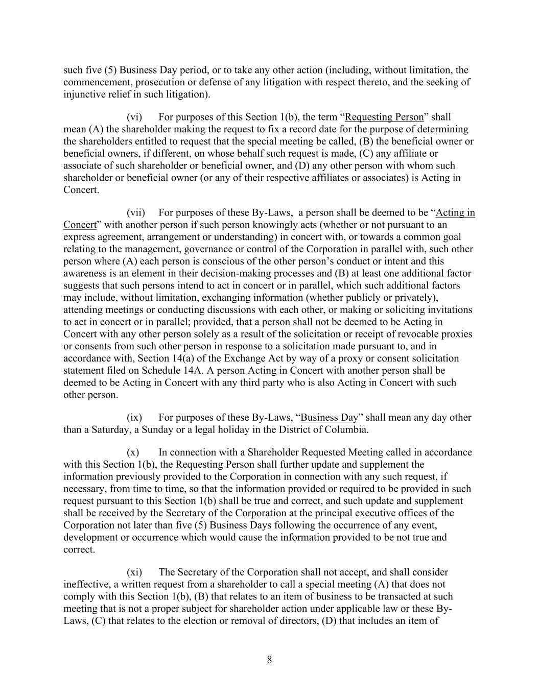 8 such five (5) Business Day period, or to take any other action (including, without limitation, the commencement, prosecution or defense of any litigation with respect thereto, and the seeking of injunctive relief in such litigation). (vi) For purposes of this Section 1(b), the term “Requesting Person” shall mean (A) the shareholder making the request to fix a record date for the purpose of determining the shareholders entitled to request that the special meeting be called, (B) the beneficial owner or beneficial owners, if different, on whose behalf such request is made, (C) any affiliate or associate of such shareholder or beneficial owner, and (D) any other person with whom such shareholder or beneficial owner (or any of their respective affiliates or associates) is Acting in Concert. (vii) For purposes of these By-Laws, a person shall be deemed to be “Acting in Concert” with another person if such person knowingly acts (whether or not pursuant to an express agreement, arrangement or understanding) in concert with, or towards a common goal relating to the management, governance or control of the Corporation in parallel with, such other person where (A) each person is conscious of the other person’s conduct or intent and this awareness is an element in their decision-making processes and (B) at least one additional factor suggests that such persons intend to act in concert or in parallel, which such additional factors may include, without limitation, exchanging information (whether publicly or privately), attending meetings or conducting discussions with each other, or making or soliciting invitations to act in concert or in parallel; provided, that a person shall not be deemed to be Acting in Concert with any other person solely as a result of the solicitation or receipt of revocable proxies or consents from such other person in response to a solicitation made pursuant to, and in accordance with, Section 14(a) of the Exchange Act by way of a proxy or consent solicitation statement filed on Schedule 14A. A person Acting in Concert with another person shall be deemed to be Acting in Concert with any third party who is also Acting in Concert with such other person. (ix) For purposes of these By-Laws, “Business Day” shall mean any day other than a Saturday, a Sunday or a legal holiday in the District of Columbia. (x) In connection with a Shareholder Requested Meeting called in accordance with this Section 1(b), the Requesting Person shall further update and supplement the information previously provided to the Corporation in connection with any such request, if necessary, from time to time, so that the information provided or required to be provided in such request pursuant to this Section 1(b) shall be true and correct, and such update and supplement shall be received by the Secretary of the Corporation at the principal executive offices of the Corporation not later than five (5) Business Days following the occurrence of any event, development or occurrence which would cause the information provided to be not true and correct. (xi) The Secretary of the Corporation shall not accept, and shall consider ineffective, a written request from a shareholder to call a special meeting (A) that does not comply with this Section 1(b), (B) that relates to an item of business to be transacted at such meeting that is not a proper subject for shareholder action under applicable law or these By- Laws, (C) that relates to the election or removal of directors, (D) that includes an item of