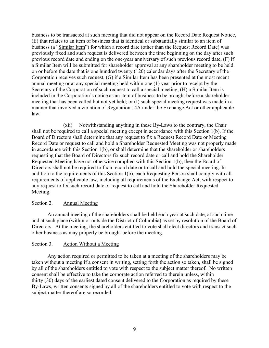 9 business to be transacted at such meeting that did not appear on the Record Date Request Notice, (E) that relates to an item of business that is identical or substantially similar to an item of business (a “Similar Item”) for which a record date (other than the Request Record Date) was previously fixed and such request is delivered between the time beginning on the day after such previous record date and ending on the one-year anniversary of such previous record date, (F) if a Similar Item will be submitted for shareholder approval at any shareholder meeting to be held on or before the date that is one hundred twenty (120) calendar days after the Secretary of the Corporation receives such request, (G) if a Similar Item has been presented at the most recent annual meeting or at any special meeting held within one (1) year prior to receipt by the Secretary of the Corporation of such request to call a special meeting, (H) a Similar Item is included in the Corporation’s notice as an item of business to be brought before a shareholder meeting that has been called but not yet held; or (I) such special meeting request was made in a manner that involved a violation of Regulation 14A under the Exchange Act or other applicable law. (xii) Notwithstanding anything in these By-Laws to the contrary, the Chair shall not be required to call a special meeting except in accordance with this Section 1(b). If the Board of Directors shall determine that any request to fix a Request Record Date or Meeting Record Date or request to call and hold a Shareholder Requested Meeting was not properly made in accordance with this Section 1(b), or shall determine that the shareholder or shareholders requesting that the Board of Directors fix such record date or call and hold the Shareholder Requested Meeting have not otherwise complied with this Section 1(b), then the Board of Directors shall not be required to fix a record date or to call and hold the special meeting. In addition to the requirements of this Section 1(b), each Requesting Person shall comply with all requirements of applicable law, including all requirements of the Exchange Act, with respect to any request to fix such record date or request to call and hold the Shareholder Requested Meeting. Section 2. Annual Meeting An annual meeting of the shareholders shall be held each year at such date, at such time and at such place (within or outside the District of Columbia) as set by resolution of the Board of Directors. At the meeting, the shareholders entitled to vote shall elect directors and transact such other business as may properly be brought before the meeting. Section 3. Action Without a Meeting Any action required or permitted to be taken at a meeting of the shareholders may be taken without a meeting if a consent in writing, setting forth the action so taken, shall be signed by all of the shareholders entitled to vote with respect to the subject matter thereof. No written consent shall be effective to take the corporate action referred to therein unless, within thirty (30) days of the earliest dated consent delivered to the Corporation as required by these By-Laws, written consents signed by all of the shareholders entitled to vote with respect to the subject matter thereof are so recorded.