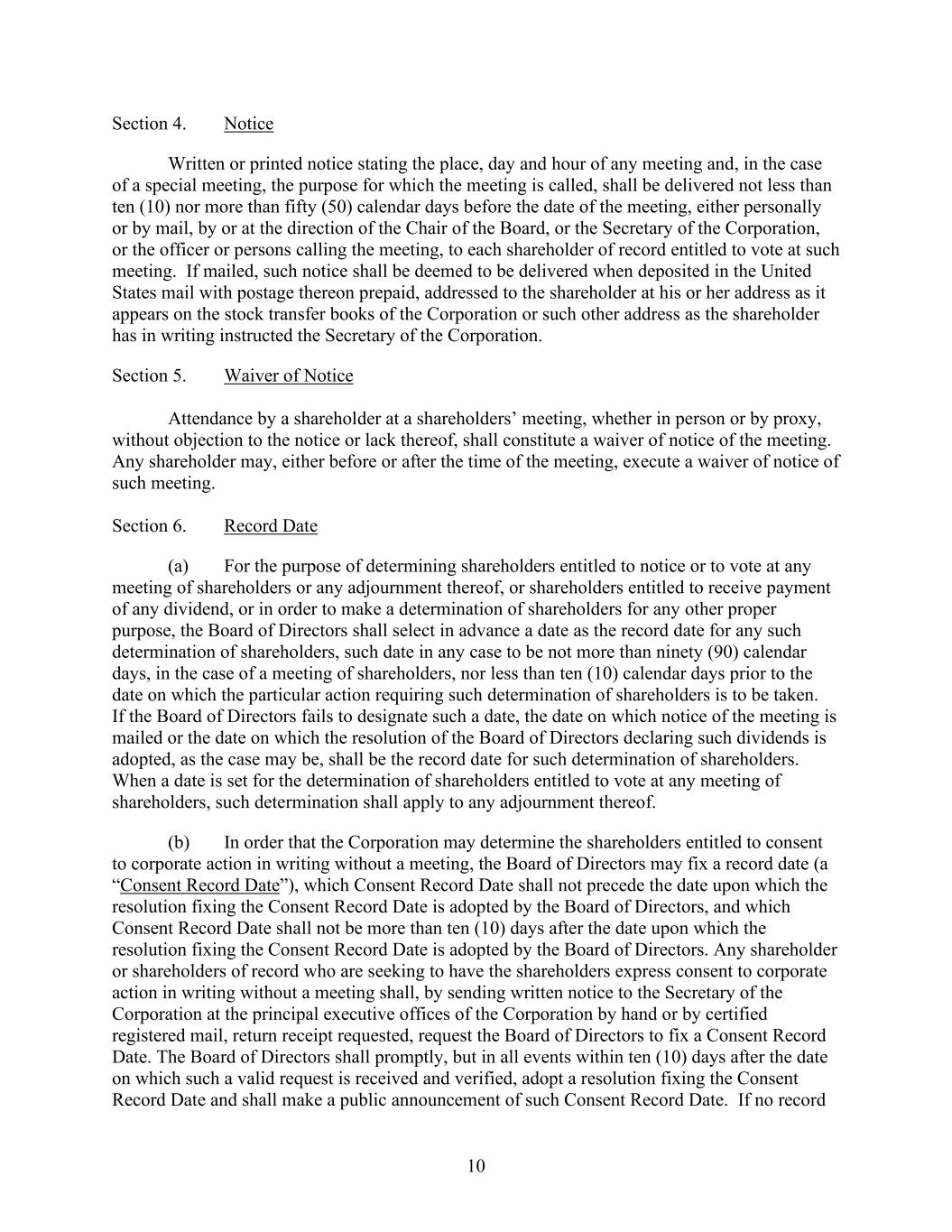 10 Section 4. Notice Written or printed notice stating the place, day and hour of any meeting and, in the case of a special meeting, the purpose for which the meeting is called, shall be delivered not less than ten (10) nor more than fifty (50) calendar days before the date of the meeting, either personally or by mail, by or at the direction of the Chair of the Board, or the Secretary of the Corporation, or the officer or persons calling the meeting, to each shareholder of record entitled to vote at such meeting. If mailed, such notice shall be deemed to be delivered when deposited in the United States mail with postage thereon prepaid, addressed to the shareholder at his or her address as it appears on the stock transfer books of the Corporation or such other address as the shareholder has in writing instructed the Secretary of the Corporation. Section 5. Waiver of Notice Attendance by a shareholder at a shareholders’ meeting, whether in person or by proxy, without objection to the notice or lack thereof, shall constitute a waiver of notice of the meeting. Any shareholder may, either before or after the time of the meeting, execute a waiver of notice of such meeting. Section 6. Record Date (a) For the purpose of determining shareholders entitled to notice or to vote at any meeting of shareholders or any adjournment thereof, or shareholders entitled to receive payment of any dividend, or in order to make a determination of shareholders for any other proper purpose, the Board of Directors shall select in advance a date as the record date for any such determination of shareholders, such date in any case to be not more than ninety (90) calendar days, in the case of a meeting of shareholders, nor less than ten (10) calendar days prior to the date on which the particular action requiring such determination of shareholders is to be taken. If the Board of Directors fails to designate such a date, the date on which notice of the meeting is mailed or the date on which the resolution of the Board of Directors declaring such dividends is adopted, as the case may be, shall be the record date for such determination of shareholders. When a date is set for the determination of shareholders entitled to vote at any meeting of shareholders, such determination shall apply to any adjournment thereof. (b) In order that the Corporation may determine the shareholders entitled to consent to corporate action in writing without a meeting, the Board of Directors may fix a record date (a “Consent Record Date”), which Consent Record Date shall not precede the date upon which the resolution fixing the Consent Record Date is adopted by the Board of Directors, and which Consent Record Date shall not be more than ten (10) days after the date upon which the resolution fixing the Consent Record Date is adopted by the Board of Directors. Any shareholder or shareholders of record who are seeking to have the shareholders express consent to corporate action in writing without a meeting shall, by sending written notice to the Secretary of the Corporation at the principal executive offices of the Corporation by hand or by certified registered mail, return receipt requested, request the Board of Directors to fix a Consent Record Date. The Board of Directors shall promptly, but in all events within ten (10) days after the date on which such a valid request is received and verified, adopt a resolution fixing the Consent Record Date and shall make a public announcement of such Consent Record Date. If no record