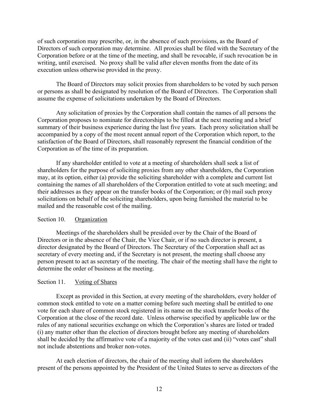 12 of such corporation may prescribe, or, in the absence of such provisions, as the Board of Directors of such corporation may determine. All proxies shall be filed with the Secretary of the Corporation before or at the time of the meeting, and shall be revocable, if such revocation be in writing, until exercised. No proxy shall be valid after eleven months from the date of its execution unless otherwise provided in the proxy. The Board of Directors may solicit proxies from shareholders to be voted by such person or persons as shall be designated by resolution of the Board of Directors. The Corporation shall assume the expense of solicitations undertaken by the Board of Directors. Any solicitation of proxies by the Corporation shall contain the names of all persons the Corporation proposes to nominate for directorships to be filled at the next meeting and a brief summary of their business experience during the last five years. Each proxy solicitation shall be accompanied by a copy of the most recent annual report of the Corporation which report, to the satisfaction of the Board of Directors, shall reasonably represent the financial condition of the Corporation as of the time of its preparation. If any shareholder entitled to vote at a meeting of shareholders shall seek a list of shareholders for the purpose of soliciting proxies from any other shareholders, the Corporation may, at its option, either (a) provide the soliciting shareholder with a complete and current list containing the names of all shareholders of the Corporation entitled to vote at such meeting; and their addresses as they appear on the transfer books of the Corporation; or (b) mail such proxy solicitations on behalf of the soliciting shareholders, upon being furnished the material to be mailed and the reasonable cost of the mailing. Section 10. Organization Meetings of the shareholders shall be presided over by the Chair of the Board of Directors or in the absence of the Chair, the Vice Chair, or if no such director is present, a director designated by the Board of Directors. The Secretary of the Corporation shall act as secretary of every meeting and, if the Secretary is not present, the meeting shall choose any person present to act as secretary of the meeting. The chair of the meeting shall have the right to determine the order of business at the meeting. Section 11. Voting of Shares Except as provided in this Section, at every meeting of the shareholders, every holder of common stock entitled to vote on a matter coming before such meeting shall be entitled to one vote for each share of common stock registered in its name on the stock transfer books of the Corporation at the close of the record date. Unless otherwise specified by applicable law or the rules of any national securities exchange on which the Corporation’s shares are listed or traded (i) any matter other than the election of directors brought before any meeting of shareholders shall be decided by the affirmative vote of a majority of the votes cast and (ii) “votes cast” shall not include abstentions and broker non-votes. At each election of directors, the chair of the meeting shall inform the shareholders present of the persons appointed by the President of the United States to serve as directors of the