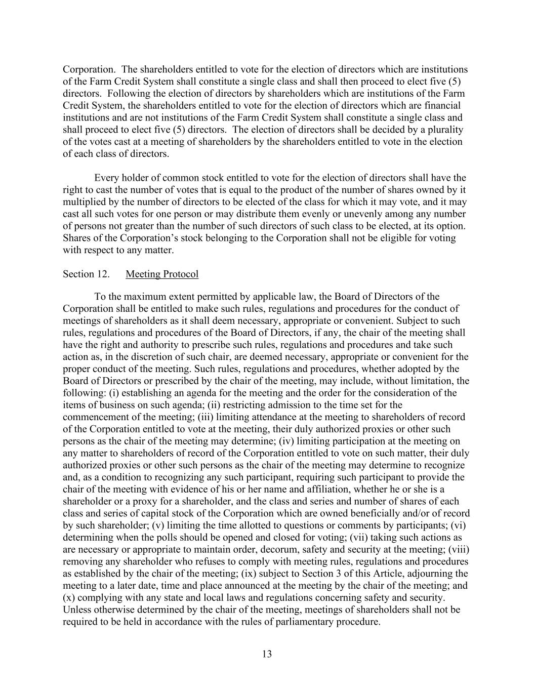 13 Corporation. The shareholders entitled to vote for the election of directors which are institutions of the Farm Credit System shall constitute a single class and shall then proceed to elect five (5) directors. Following the election of directors by shareholders which are institutions of the Farm Credit System, the shareholders entitled to vote for the election of directors which are financial institutions and are not institutions of the Farm Credit System shall constitute a single class and shall proceed to elect five (5) directors. The election of directors shall be decided by a plurality of the votes cast at a meeting of shareholders by the shareholders entitled to vote in the election of each class of directors. Every holder of common stock entitled to vote for the election of directors shall have the right to cast the number of votes that is equal to the product of the number of shares owned by it multiplied by the number of directors to be elected of the class for which it may vote, and it may cast all such votes for one person or may distribute them evenly or unevenly among any number of persons not greater than the number of such directors of such class to be elected, at its option. Shares of the Corporation’s stock belonging to the Corporation shall not be eligible for voting with respect to any matter. Section 12. Meeting Protocol To the maximum extent permitted by applicable law, the Board of Directors of the Corporation shall be entitled to make such rules, regulations and procedures for the conduct of meetings of shareholders as it shall deem necessary, appropriate or convenient. Subject to such rules, regulations and procedures of the Board of Directors, if any, the chair of the meeting shall have the right and authority to prescribe such rules, regulations and procedures and take such action as, in the discretion of such chair, are deemed necessary, appropriate or convenient for the proper conduct of the meeting. Such rules, regulations and procedures, whether adopted by the Board of Directors or prescribed by the chair of the meeting, may include, without limitation, the following: (i) establishing an agenda for the meeting and the order for the consideration of the items of business on such agenda; (ii) restricting admission to the time set for the commencement of the meeting; (iii) limiting attendance at the meeting to shareholders of record of the Corporation entitled to vote at the meeting, their duly authorized proxies or other such persons as the chair of the meeting may determine; (iv) limiting participation at the meeting on any matter to shareholders of record of the Corporation entitled to vote on such matter, their duly authorized proxies or other such persons as the chair of the meeting may determine to recognize and, as a condition to recognizing any such participant, requiring such participant to provide the chair of the meeting with evidence of his or her name and affiliation, whether he or she is a shareholder or a proxy for a shareholder, and the class and series and number of shares of each class and series of capital stock of the Corporation which are owned beneficially and/or of record by such shareholder; (v) limiting the time allotted to questions or comments by participants; (vi) determining when the polls should be opened and closed for voting; (vii) taking such actions as are necessary or appropriate to maintain order, decorum, safety and security at the meeting; (viii) removing any shareholder who refuses to comply with meeting rules, regulations and procedures as established by the chair of the meeting; (ix) subject to Section 3 of this Article, adjourning the meeting to a later date, time and place announced at the meeting by the chair of the meeting; and (x) complying with any state and local laws and regulations concerning safety and security. Unless otherwise determined by the chair of the meeting, meetings of shareholders shall not be required to be held in accordance with the rules of parliamentary procedure.