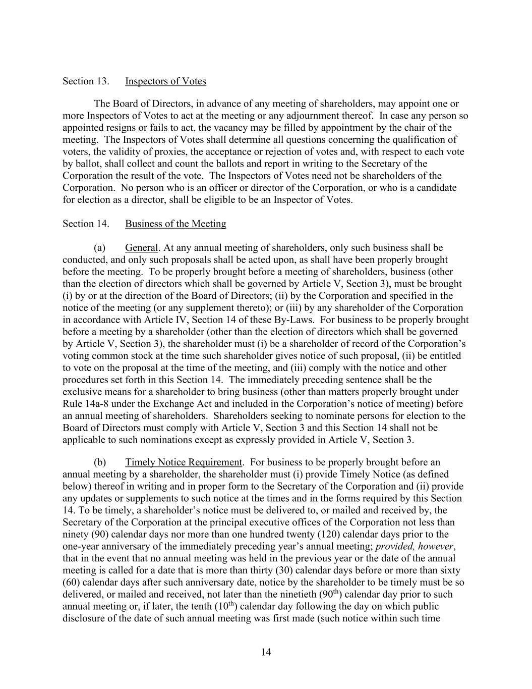 14 Section 13. Inspectors of Votes The Board of Directors, in advance of any meeting of shareholders, may appoint one or more Inspectors of Votes to act at the meeting or any adjournment thereof. In case any person so appointed resigns or fails to act, the vacancy may be filled by appointment by the chair of the meeting. The Inspectors of Votes shall determine all questions concerning the qualification of voters, the validity of proxies, the acceptance or rejection of votes and, with respect to each vote by ballot, shall collect and count the ballots and report in writing to the Secretary of the Corporation the result of the vote. The Inspectors of Votes need not be shareholders of the Corporation. No person who is an officer or director of the Corporation, or who is a candidate for election as a director, shall be eligible to be an Inspector of Votes. Section 14. Business of the Meeting (a) General. At any annual meeting of shareholders, only such business shall be conducted, and only such proposals shall be acted upon, as shall have been properly brought before the meeting. To be properly brought before a meeting of shareholders, business (other than the election of directors which shall be governed by Article V, Section 3), must be brought (i) by or at the direction of the Board of Directors; (ii) by the Corporation and specified in the notice of the meeting (or any supplement thereto); or (iii) by any shareholder of the Corporation in accordance with Article IV, Section 14 of these By-Laws. For business to be properly brought before a meeting by a shareholder (other than the election of directors which shall be governed by Article V, Section 3), the shareholder must (i) be a shareholder of record of the Corporation’s voting common stock at the time such shareholder gives notice of such proposal, (ii) be entitled to vote on the proposal at the time of the meeting, and (iii) comply with the notice and other procedures set forth in this Section 14. The immediately preceding sentence shall be the exclusive means for a shareholder to bring business (other than matters properly brought under Rule 14a-8 under the Exchange Act and included in the Corporation’s notice of meeting) before an annual meeting of shareholders. Shareholders seeking to nominate persons for election to the Board of Directors must comply with Article V, Section 3 and this Section 14 shall not be applicable to such nominations except as expressly provided in Article V, Section 3. (b) Timely Notice Requirement. For business to be properly brought before an annual meeting by a shareholder, the shareholder must (i) provide Timely Notice (as defined below) thereof in writing and in proper form to the Secretary of the Corporation and (ii) provide any updates or supplements to such notice at the times and in the forms required by this Section 14. To be timely, a shareholder’s notice must be delivered to, or mailed and received by, the Secretary of the Corporation at the principal executive offices of the Corporation not less than ninety (90) calendar days nor more than one hundred twenty (120) calendar days prior to the one-year anniversary of the immediately preceding year’s annual meeting; provided, however, that in the event that no annual meeting was held in the previous year or the date of the annual meeting is called for a date that is more than thirty (30) calendar days before or more than sixty (60) calendar days after such anniversary date, notice by the shareholder to be timely must be so delivered, or mailed and received, not later than the ninetieth (90th) calendar day prior to such annual meeting or, if later, the tenth (10th) calendar day following the day on which public disclosure of the date of such annual meeting was first made (such notice within such time