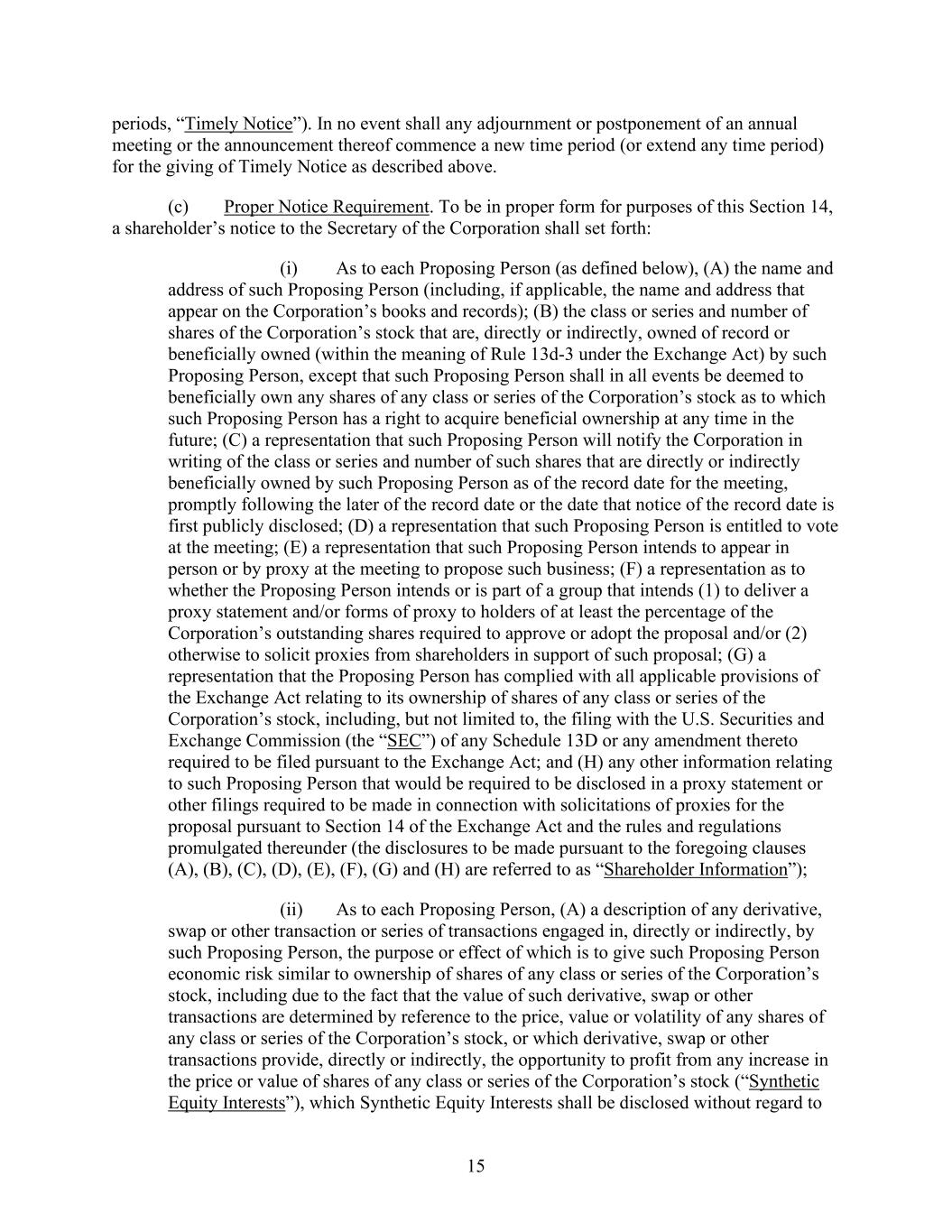 15 periods, “Timely Notice”). In no event shall any adjournment or postponement of an annual meeting or the announcement thereof commence a new time period (or extend any time period) for the giving of Timely Notice as described above. (c) Proper Notice Requirement. To be in proper form for purposes of this Section 14, a shareholder’s notice to the Secretary of the Corporation shall set forth: (i) As to each Proposing Person (as defined below), (A) the name and address of such Proposing Person (including, if applicable, the name and address that appear on the Corporation’s books and records); (B) the class or series and number of shares of the Corporation’s stock that are, directly or indirectly, owned of record or beneficially owned (within the meaning of Rule 13d-3 under the Exchange Act) by such Proposing Person, except that such Proposing Person shall in all events be deemed to beneficially own any shares of any class or series of the Corporation’s stock as to which such Proposing Person has a right to acquire beneficial ownership at any time in the future; (C) a representation that such Proposing Person will notify the Corporation in writing of the class or series and number of such shares that are directly or indirectly beneficially owned by such Proposing Person as of the record date for the meeting, promptly following the later of the record date or the date that notice of the record date is first publicly disclosed; (D) a representation that such Proposing Person is entitled to vote at the meeting; (E) a representation that such Proposing Person intends to appear in person or by proxy at the meeting to propose such business; (F) a representation as to whether the Proposing Person intends or is part of a group that intends (1) to deliver a proxy statement and/or forms of proxy to holders of at least the percentage of the Corporation’s outstanding shares required to approve or adopt the proposal and/or (2) otherwise to solicit proxies from shareholders in support of such proposal; (G) a representation that the Proposing Person has complied with all applicable provisions of the Exchange Act relating to its ownership of shares of any class or series of the Corporation’s stock, including, but not limited to, the filing with the U.S. Securities and Exchange Commission (the “SEC”) of any Schedule 13D or any amendment thereto required to be filed pursuant to the Exchange Act; and (H) any other information relating to such Proposing Person that would be required to be disclosed in a proxy statement or other filings required to be made in connection with solicitations of proxies for the proposal pursuant to Section 14 of the Exchange Act and the rules and regulations promulgated thereunder (the disclosures to be made pursuant to the foregoing clauses (A), (B), (C), (D), (E), (F), (G) and (H) are referred to as “Shareholder Information”); (ii) As to each Proposing Person, (A) a description of any derivative, swap or other transaction or series of transactions engaged in, directly or indirectly, by such Proposing Person, the purpose or effect of which is to give such Proposing Person economic risk similar to ownership of shares of any class or series of the Corporation’s stock, including due to the fact that the value of such derivative, swap or other transactions are determined by reference to the price, value or volatility of any shares of any class or series of the Corporation’s stock, or which derivative, swap or other transactions provide, directly or indirectly, the opportunity to profit from any increase in the price or value of shares of any class or series of the Corporation’s stock (“Synthetic Equity Interests”), which Synthetic Equity Interests shall be disclosed without regard to