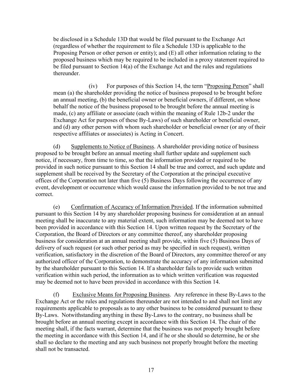 17 be disclosed in a Schedule 13D that would be filed pursuant to the Exchange Act (regardless of whether the requirement to file a Schedule 13D is applicable to the Proposing Person or other person or entity); and (E) all other information relating to the proposed business which may be required to be included in a proxy statement required to be filed pursuant to Section 14(a) of the Exchange Act and the rules and regulations thereunder. (iv) For purposes of this Section 14, the term “Proposing Person” shall mean (a) the shareholder providing the notice of business proposed to be brought before an annual meeting, (b) the beneficial owner or beneficial owners, if different, on whose behalf the notice of the business proposed to be brought before the annual meeting is made, (c) any affiliate or associate (each within the meaning of Rule 12b-2 under the Exchange Act for purposes of these By-Laws) of such shareholder or beneficial owner, and (d) any other person with whom such shareholder or beneficial owner (or any of their respective affiliates or associates) is Acting in Concert. (d) Supplements to Notice of Business. A shareholder providing notice of business proposed to be brought before an annual meeting shall further update and supplement such notice, if necessary, from time to time, so that the information provided or required to be provided in such notice pursuant to this Section 14 shall be true and correct, and such update and supplement shall be received by the Secretary of the Corporation at the principal executive offices of the Corporation not later than five (5) Business Days following the occurrence of any event, development or occurrence which would cause the information provided to be not true and correct. (e) Confirmation of Accuracy of Information Provided. If the information submitted pursuant to this Section 14 by any shareholder proposing business for consideration at an annual meeting shall be inaccurate to any material extent, such information may be deemed not to have been provided in accordance with this Section 14. Upon written request by the Secretary of the Corporation, the Board of Directors or any committee thereof, any shareholder proposing business for consideration at an annual meeting shall provide, within five (5) Business Days of delivery of such request (or such other period as may be specified in such request), written verification, satisfactory in the discretion of the Board of Directors, any committee thereof or any authorized officer of the Corporation, to demonstrate the accuracy of any information submitted by the shareholder pursuant to this Section 14. If a shareholder fails to provide such written verification within such period, the information as to which written verification was requested may be deemed not to have been provided in accordance with this Section 14. (f) Exclusive Means for Proposing Business. Any reference in these By-Laws to the Exchange Act or the rules and regulations thereunder are not intended to and shall not limit any requirements applicable to proposals as to any other business to be considered pursuant to these By-Laws. Notwithstanding anything in these By-Laws to the contrary, no business shall be brought before an annual meeting except in accordance with this Section 14. The chair of the meeting shall, if the facts warrant, determine that the business was not properly brought before the meeting in accordance with this Section 14, and if he or she should so determine, he or she shall so declare to the meeting and any such business not properly brought before the meeting shall not be transacted.