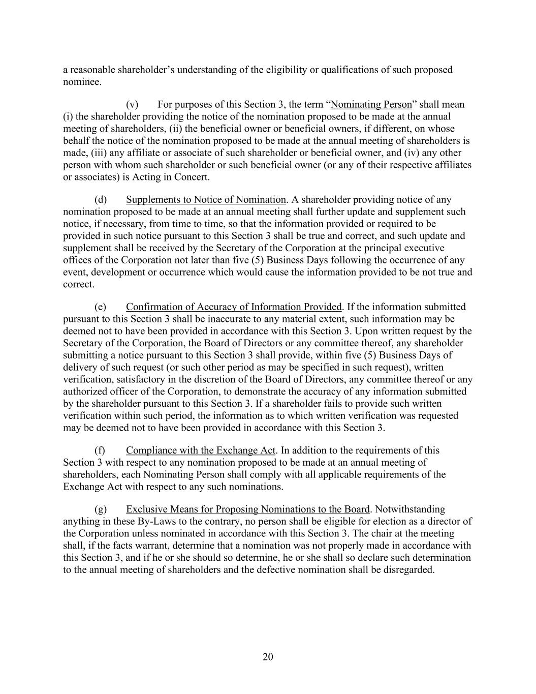 20 a reasonable shareholder’s understanding of the eligibility or qualifications of such proposed nominee. (v) For purposes of this Section 3, the term “Nominating Person” shall mean (i) the shareholder providing the notice of the nomination proposed to be made at the annual meeting of shareholders, (ii) the beneficial owner or beneficial owners, if different, on whose behalf the notice of the nomination proposed to be made at the annual meeting of shareholders is made, (iii) any affiliate or associate of such shareholder or beneficial owner, and (iv) any other person with whom such shareholder or such beneficial owner (or any of their respective affiliates or associates) is Acting in Concert. (d) Supplements to Notice of Nomination. A shareholder providing notice of any nomination proposed to be made at an annual meeting shall further update and supplement such notice, if necessary, from time to time, so that the information provided or required to be provided in such notice pursuant to this Section 3 shall be true and correct, and such update and supplement shall be received by the Secretary of the Corporation at the principal executive offices of the Corporation not later than five (5) Business Days following the occurrence of any event, development or occurrence which would cause the information provided to be not true and correct. (e) Confirmation of Accuracy of Information Provided. If the information submitted pursuant to this Section 3 shall be inaccurate to any material extent, such information may be deemed not to have been provided in accordance with this Section 3. Upon written request by the Secretary of the Corporation, the Board of Directors or any committee thereof, any shareholder submitting a notice pursuant to this Section 3 shall provide, within five (5) Business Days of delivery of such request (or such other period as may be specified in such request), written verification, satisfactory in the discretion of the Board of Directors, any committee thereof or any authorized officer of the Corporation, to demonstrate the accuracy of any information submitted by the shareholder pursuant to this Section 3. If a shareholder fails to provide such written verification within such period, the information as to which written verification was requested may be deemed not to have been provided in accordance with this Section 3. (f) Compliance with the Exchange Act. In addition to the requirements of this Section 3 with respect to any nomination proposed to be made at an annual meeting of shareholders, each Nominating Person shall comply with all applicable requirements of the Exchange Act with respect to any such nominations. (g) Exclusive Means for Proposing Nominations to the Board. Notwithstanding anything in these By-Laws to the contrary, no person shall be eligible for election as a director of the Corporation unless nominated in accordance with this Section 3. The chair at the meeting shall, if the facts warrant, determine that a nomination was not properly made in accordance with this Section 3, and if he or she should so determine, he or she shall so declare such determination to the annual meeting of shareholders and the defective nomination shall be disregarded.