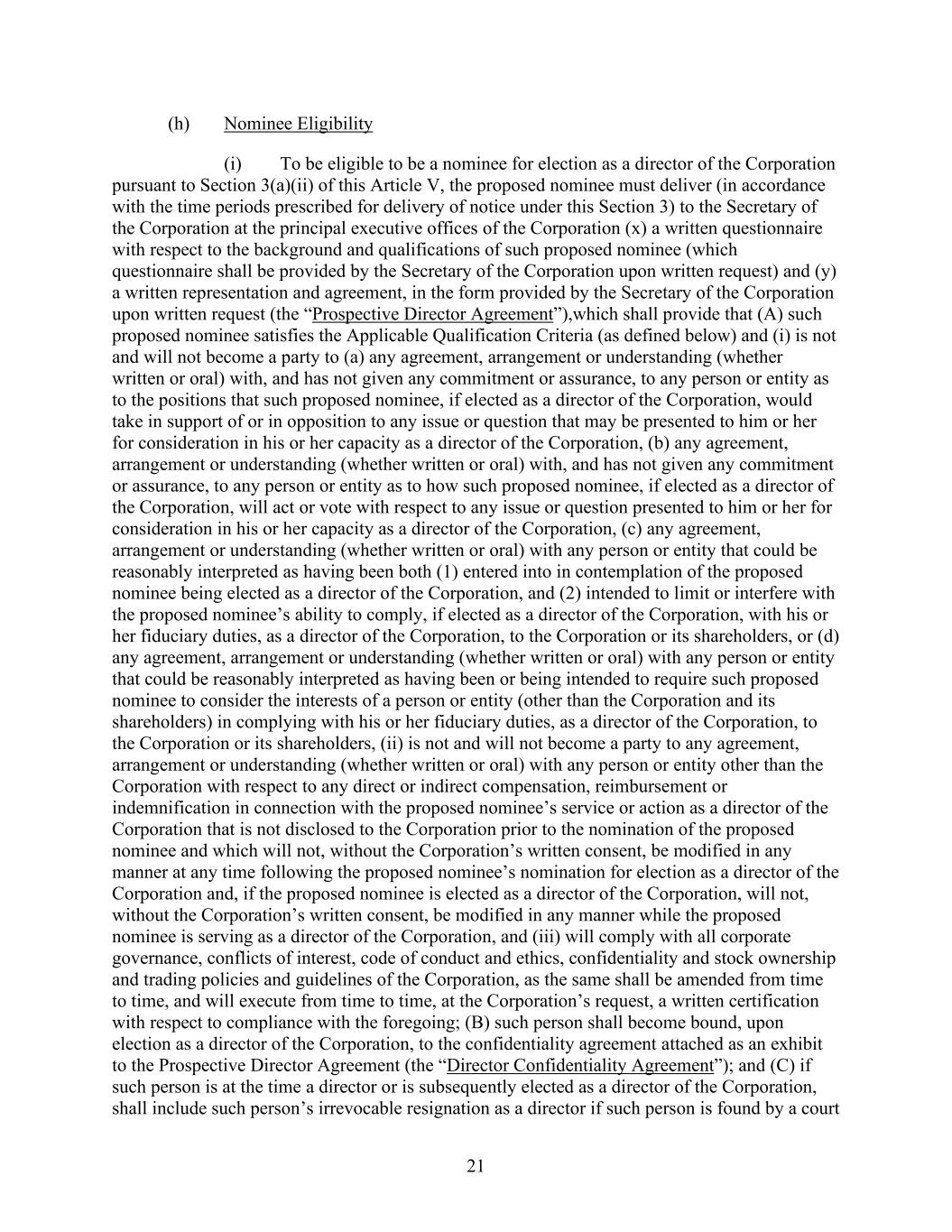 21 (h) Nominee Eligibility (i) To be eligible to be a nominee for election as a director of the Corporation pursuant to Section 3(a)(ii) of this Article V, the proposed nominee must deliver (in accordance with the time periods prescribed for delivery of notice under this Section 3) to the Secretary of the Corporation at the principal executive offices of the Corporation (x) a written questionnaire with respect to the background and qualifications of such proposed nominee (which questionnaire shall be provided by the Secretary of the Corporation upon written request) and (y) a written representation and agreement, in the form provided by the Secretary of the Corporation upon written request (the “Prospective Director Agreement”),which shall provide that (A) such proposed nominee satisfies the Applicable Qualification Criteria (as defined below) and (i) is not and will not become a party to (a) any agreement, arrangement or understanding (whether written or oral) with, and has not given any commitment or assurance, to any person or entity as to the positions that such proposed nominee, if elected as a director of the Corporation, would take in support of or in opposition to any issue or question that may be presented to him or her for consideration in his or her capacity as a director of the Corporation, (b) any agreement, arrangement or understanding (whether written or oral) with, and has not given any commitment or assurance, to any person or entity as to how such proposed nominee, if elected as a director of the Corporation, will act or vote with respect to any issue or question presented to him or her for consideration in his or her capacity as a director of the Corporation, (c) any agreement, arrangement or understanding (whether written or oral) with any person or entity that could be reasonably interpreted as having been both (1) entered into in contemplation of the proposed nominee being elected as a director of the Corporation, and (2) intended to limit or interfere with the proposed nominee’s ability to comply, if elected as a director of the Corporation, with his or her fiduciary duties, as a director of the Corporation, to the Corporation or its shareholders, or (d) any agreement, arrangement or understanding (whether written or oral) with any person or entity that could be reasonably interpreted as having been or being intended to require such proposed nominee to consider the interests of a person or entity (other than the Corporation and its shareholders) in complying with his or her fiduciary duties, as a director of the Corporation, to the Corporation or its shareholders, (ii) is not and will not become a party to any agreement, arrangement or understanding (whether written or oral) with any person or entity other than the Corporation with respect to any direct or indirect compensation, reimbursement or indemnification in connection with the proposed nominee’s service or action as a director of the Corporation that is not disclosed to the Corporation prior to the nomination of the proposed nominee and which will not, without the Corporation’s written consent, be modified in any manner at any time following the proposed nominee’s nomination for election as a director of the Corporation and, if the proposed nominee is elected as a director of the Corporation, will not, without the Corporation’s written consent, be modified in any manner while the proposed nominee is serving as a director of the Corporation, and (iii) will comply with all corporate governance, conflicts of interest, code of conduct and ethics, confidentiality and stock ownership and trading policies and guidelines of the Corporation, as the same shall be amended from time to time, and will execute from time to time, at the Corporation’s request, a written certification with respect to compliance with the foregoing; (B) such person shall become bound, upon election as a director of the Corporation, to the confidentiality agreement attached as an exhibit to the Prospective Director Agreement (the “Director Confidentiality Agreement”); and (C) if such person is at the time a director or is subsequently elected as a director of the Corporation, shall include such person’s irrevocable resignation as a director if such person is found by a court