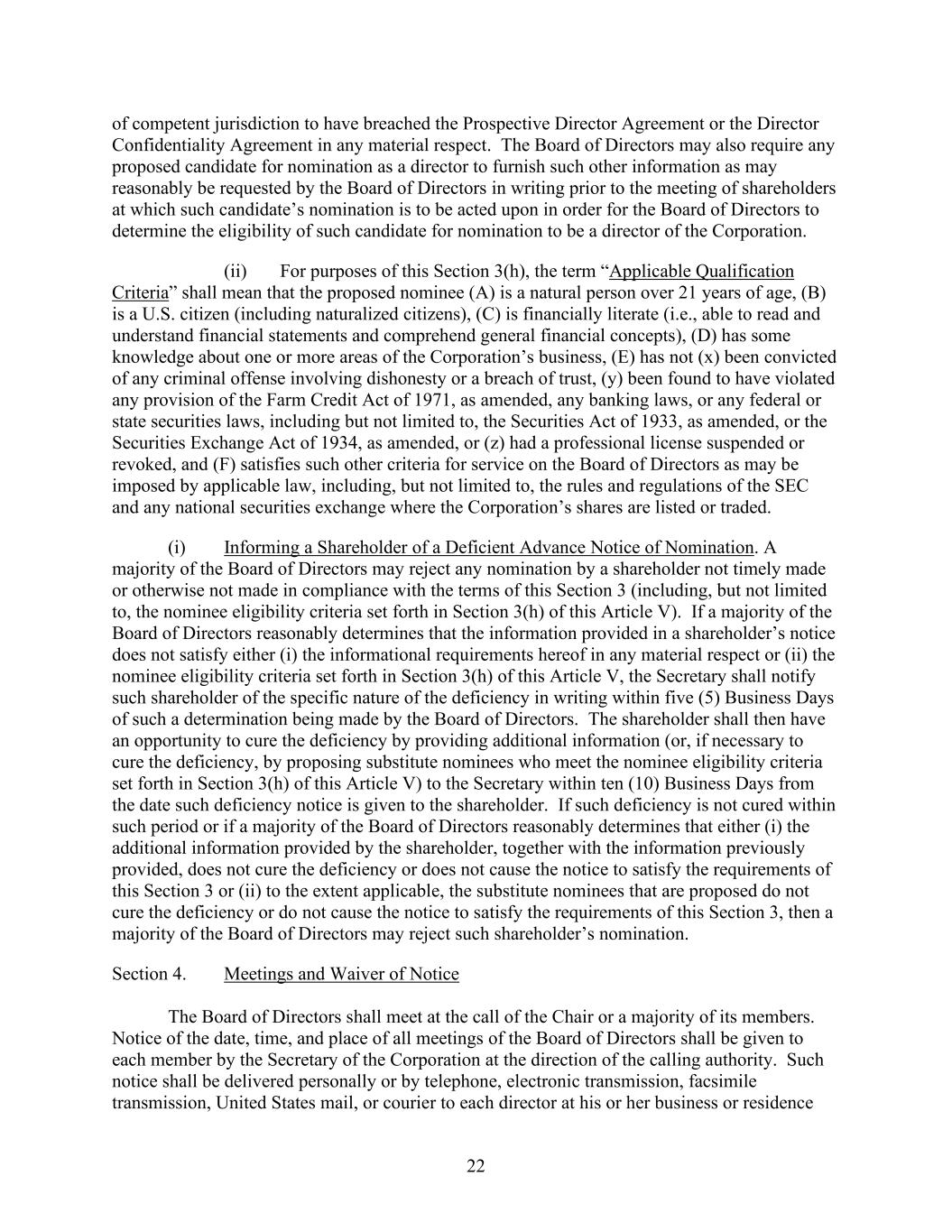 22 of competent jurisdiction to have breached the Prospective Director Agreement or the Director Confidentiality Agreement in any material respect. The Board of Directors may also require any proposed candidate for nomination as a director to furnish such other information as may reasonably be requested by the Board of Directors in writing prior to the meeting of shareholders at which such candidate’s nomination is to be acted upon in order for the Board of Directors to determine the eligibility of such candidate for nomination to be a director of the Corporation. (ii) For purposes of this Section 3(h), the term “Applicable Qualification Criteria” shall mean that the proposed nominee (A) is a natural person over 21 years of age, (B) is a U.S. citizen (including naturalized citizens), (C) is financially literate (i.e., able to read and understand financial statements and comprehend general financial concepts), (D) has some knowledge about one or more areas of the Corporation’s business, (E) has not (x) been convicted of any criminal offense involving dishonesty or a breach of trust, (y) been found to have violated any provision of the Farm Credit Act of 1971, as amended, any banking laws, or any federal or state securities laws, including but not limited to, the Securities Act of 1933, as amended, or the Securities Exchange Act of 1934, as amended, or (z) had a professional license suspended or revoked, and (F) satisfies such other criteria for service on the Board of Directors as may be imposed by applicable law, including, but not limited to, the rules and regulations of the SEC and any national securities exchange where the Corporation’s shares are listed or traded. (i) Informing a Shareholder of a Deficient Advance Notice of Nomination. A majority of the Board of Directors may reject any nomination by a shareholder not timely made or otherwise not made in compliance with the terms of this Section 3 (including, but not limited to, the nominee eligibility criteria set forth in Section 3(h) of this Article V). If a majority of the Board of Directors reasonably determines that the information provided in a shareholder’s notice does not satisfy either (i) the informational requirements hereof in any material respect or (ii) the nominee eligibility criteria set forth in Section 3(h) of this Article V, the Secretary shall notify such shareholder of the specific nature of the deficiency in writing within five (5) Business Days of such a determination being made by the Board of Directors. The shareholder shall then have an opportunity to cure the deficiency by providing additional information (or, if necessary to cure the deficiency, by proposing substitute nominees who meet the nominee eligibility criteria set forth in Section 3(h) of this Article V) to the Secretary within ten (10) Business Days from the date such deficiency notice is given to the shareholder. If such deficiency is not cured within such period or if a majority of the Board of Directors reasonably determines that either (i) the additional information provided by the shareholder, together with the information previously provided, does not cure the deficiency or does not cause the notice to satisfy the requirements of this Section 3 or (ii) to the extent applicable, the substitute nominees that are proposed do not cure the deficiency or do not cause the notice to satisfy the requirements of this Section 3, then a majority of the Board of Directors may reject such shareholder’s nomination. Section 4. Meetings and Waiver of Notice The Board of Directors shall meet at the call of the Chair or a majority of its members. Notice of the date, time, and place of all meetings of the Board of Directors shall be given to each member by the Secretary of the Corporation at the direction of the calling authority. Such notice shall be delivered personally or by telephone, electronic transmission, facsimile transmission, United States mail, or courier to each director at his or her business or residence