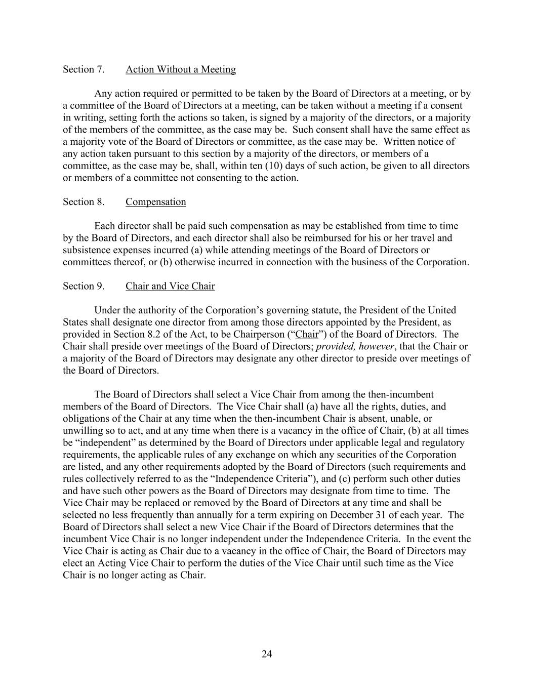 24 Section 7. Action Without a Meeting Any action required or permitted to be taken by the Board of Directors at a meeting, or by a committee of the Board of Directors at a meeting, can be taken without a meeting if a consent in writing, setting forth the actions so taken, is signed by a majority of the directors, or a majority of the members of the committee, as the case may be. Such consent shall have the same effect as a majority vote of the Board of Directors or committee, as the case may be. Written notice of any action taken pursuant to this section by a majority of the directors, or members of a committee, as the case may be, shall, within ten (10) days of such action, be given to all directors or members of a committee not consenting to the action. Section 8. Compensation Each director shall be paid such compensation as may be established from time to time by the Board of Directors, and each director shall also be reimbursed for his or her travel and subsistence expenses incurred (a) while attending meetings of the Board of Directors or committees thereof, or (b) otherwise incurred in connection with the business of the Corporation. Section 9. Chair and Vice Chair Under the authority of the Corporation’s governing statute, the President of the United States shall designate one director from among those directors appointed by the President, as provided in Section 8.2 of the Act, to be Chairperson (“Chair”) of the Board of Directors. The Chair shall preside over meetings of the Board of Directors; provided, however, that the Chair or a majority of the Board of Directors may designate any other director to preside over meetings of the Board of Directors. The Board of Directors shall select a Vice Chair from among the then-incumbent members of the Board of Directors. The Vice Chair shall (a) have all the rights, duties, and obligations of the Chair at any time when the then-incumbent Chair is absent, unable, or unwilling so to act, and at any time when there is a vacancy in the office of Chair, (b) at all times be “independent” as determined by the Board of Directors under applicable legal and regulatory requirements, the applicable rules of any exchange on which any securities of the Corporation are listed, and any other requirements adopted by the Board of Directors (such requirements and rules collectively referred to as the “Independence Criteria”), and (c) perform such other duties and have such other powers as the Board of Directors may designate from time to time. The Vice Chair may be replaced or removed by the Board of Directors at any time and shall be selected no less frequently than annually for a term expiring on December 31 of each year. The Board of Directors shall select a new Vice Chair if the Board of Directors determines that the incumbent Vice Chair is no longer independent under the Independence Criteria. In the event the Vice Chair is acting as Chair due to a vacancy in the office of Chair, the Board of Directors may elect an Acting Vice Chair to perform the duties of the Vice Chair until such time as the Vice Chair is no longer acting as Chair.