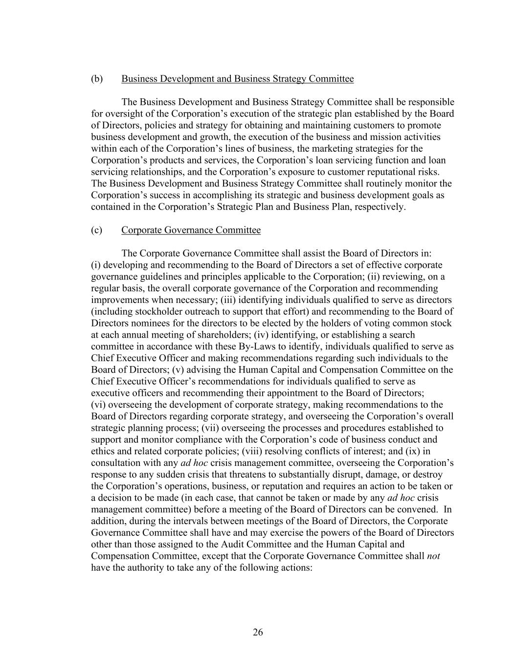 26 (b) Business Development and Business Strategy Committee The Business Development and Business Strategy Committee shall be responsible for oversight of the Corporation’s execution of the strategic plan established by the Board of Directors, policies and strategy for obtaining and maintaining customers to promote business development and growth, the execution of the business and mission activities within each of the Corporation’s lines of business, the marketing strategies for the Corporation’s products and services, the Corporation’s loan servicing function and loan servicing relationships, and the Corporation’s exposure to customer reputational risks. The Business Development and Business Strategy Committee shall routinely monitor the Corporation’s success in accomplishing its strategic and business development goals as contained in the Corporation’s Strategic Plan and Business Plan, respectively. (c) Corporate Governance Committee The Corporate Governance Committee shall assist the Board of Directors in: (i) developing and recommending to the Board of Directors a set of effective corporate governance guidelines and principles applicable to the Corporation; (ii) reviewing, on a regular basis, the overall corporate governance of the Corporation and recommending improvements when necessary; (iii) identifying individuals qualified to serve as directors (including stockholder outreach to support that effort) and recommending to the Board of Directors nominees for the directors to be elected by the holders of voting common stock at each annual meeting of shareholders; (iv) identifying, or establishing a search committee in accordance with these By-Laws to identify, individuals qualified to serve as Chief Executive Officer and making recommendations regarding such individuals to the Board of Directors; (v) advising the Human Capital and Compensation Committee on the Chief Executive Officer’s recommendations for individuals qualified to serve as executive officers and recommending their appointment to the Board of Directors; (vi) overseeing the development of corporate strategy, making recommendations to the Board of Directors regarding corporate strategy, and overseeing the Corporation’s overall strategic planning process; (vii) overseeing the processes and procedures established to support and monitor compliance with the Corporation’s code of business conduct and ethics and related corporate policies; (viii) resolving conflicts of interest; and (ix) in consultation with any ad hoc crisis management committee, overseeing the Corporation’s response to any sudden crisis that threatens to substantially disrupt, damage, or destroy the Corporation’s operations, business, or reputation and requires an action to be taken or a decision to be made (in each case, that cannot be taken or made by any ad hoc crisis management committee) before a meeting of the Board of Directors can be convened. In addition, during the intervals between meetings of the Board of Directors, the Corporate Governance Committee shall have and may exercise the powers of the Board of Directors other than those assigned to the Audit Committee and the Human Capital and Compensation Committee, except that the Corporate Governance Committee shall not have the authority to take any of the following actions: