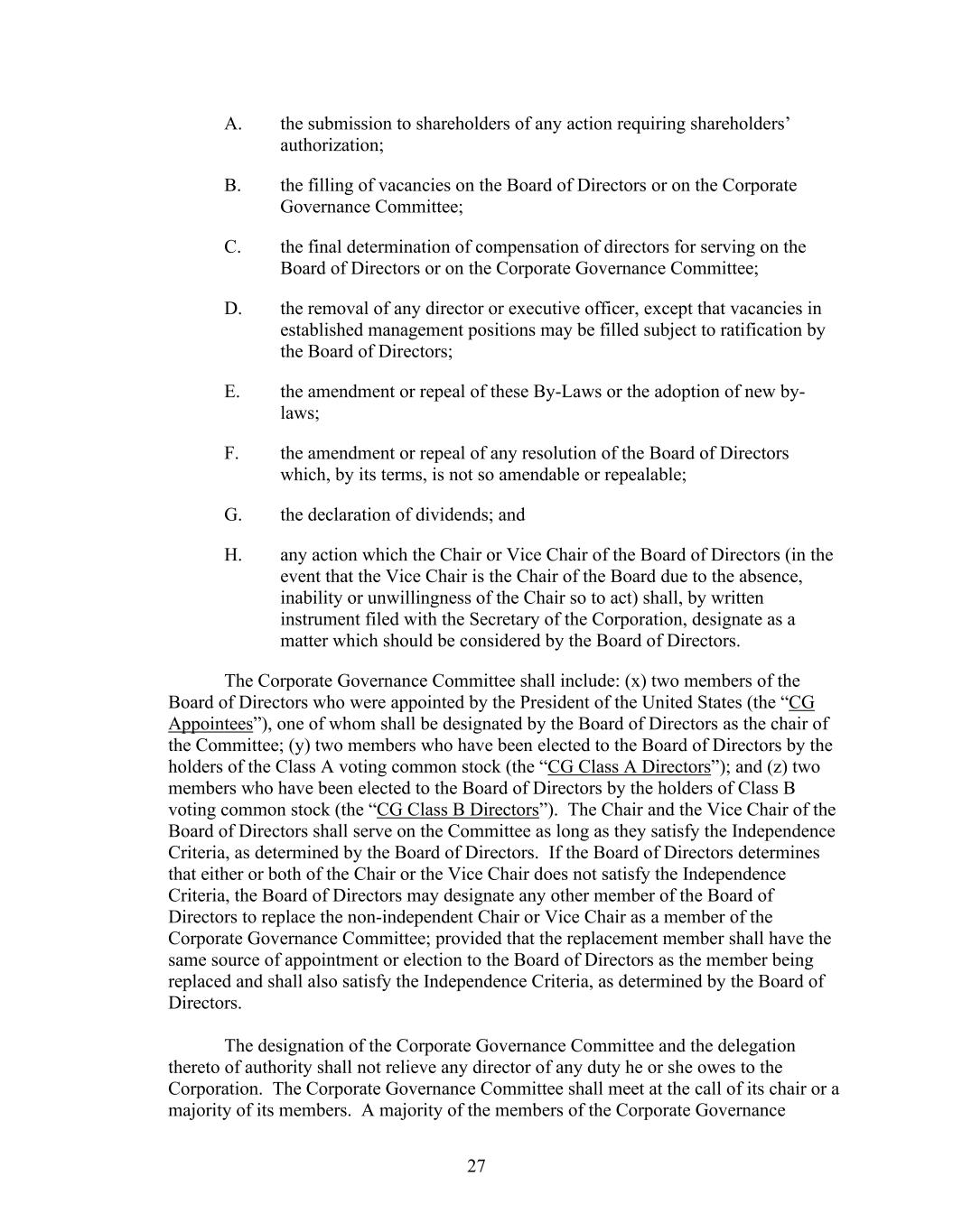 27 A. the submission to shareholders of any action requiring shareholders’ authorization; B. the filling of vacancies on the Board of Directors or on the Corporate Governance Committee; C. the final determination of compensation of directors for serving on the Board of Directors or on the Corporate Governance Committee; D. the removal of any director or executive officer, except that vacancies in established management positions may be filled subject to ratification by the Board of Directors; E. the amendment or repeal of these By-Laws or the adoption of new by- laws; F. the amendment or repeal of any resolution of the Board of Directors which, by its terms, is not so amendable or repealable; G. the declaration of dividends; and H. any action which the Chair or Vice Chair of the Board of Directors (in the event that the Vice Chair is the Chair of the Board due to the absence, inability or unwillingness of the Chair so to act) shall, by written instrument filed with the Secretary of the Corporation, designate as a matter which should be considered by the Board of Directors. The Corporate Governance Committee shall include: (x) two members of the Board of Directors who were appointed by the President of the United States (the “CG Appointees”), one of whom shall be designated by the Board of Directors as the chair of the Committee; (y) two members who have been elected to the Board of Directors by the holders of the Class A voting common stock (the “CG Class A Directors”); and (z) two members who have been elected to the Board of Directors by the holders of Class B voting common stock (the “CG Class B Directors”). The Chair and the Vice Chair of the Board of Directors shall serve on the Committee as long as they satisfy the Independence Criteria, as determined by the Board of Directors. If the Board of Directors determines that either or both of the Chair or the Vice Chair does not satisfy the Independence Criteria, the Board of Directors may designate any other member of the Board of Directors to replace the non-independent Chair or Vice Chair as a member of the Corporate Governance Committee; provided that the replacement member shall have the same source of appointment or election to the Board of Directors as the member being replaced and shall also satisfy the Independence Criteria, as determined by the Board of Directors. The designation of the Corporate Governance Committee and the delegation thereto of authority shall not relieve any director of any duty he or she owes to the Corporation. The Corporate Governance Committee shall meet at the call of its chair or a majority of its members. A majority of the members of the Corporate Governance