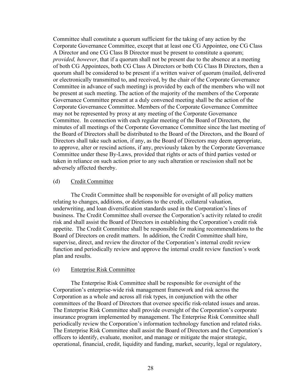 28 Committee shall constitute a quorum sufficient for the taking of any action by the Corporate Governance Committee, except that at least one CG Appointee, one CG Class A Director and one CG Class B Director must be present to constitute a quorum; provided, however, that if a quorum shall not be present due to the absence at a meeting of both CG Appointees, both CG Class A Directors or both CG Class B Directors, then a quorum shall be considered to be present if a written waiver of quorum (mailed, delivered or electronically transmitted to, and received, by the chair of the Corporate Governance Committee in advance of such meeting) is provided by each of the members who will not be present at such meeting. The action of the majority of the members of the Corporate Governance Committee present at a duly convened meeting shall be the action of the Corporate Governance Committee. Members of the Corporate Governance Committee may not be represented by proxy at any meeting of the Corporate Governance Committee. In connection with each regular meeting of the Board of Directors, the minutes of all meetings of the Corporate Governance Committee since the last meeting of the Board of Directors shall be distributed to the Board of the Directors, and the Board of Directors shall take such action, if any, as the Board of Directors may deem appropriate, to approve, alter or rescind actions, if any, previously taken by the Corporate Governance Committee under these By-Laws, provided that rights or acts of third parties vested or taken in reliance on such action prior to any such alteration or rescission shall not be adversely affected thereby. (d) Credit Committee The Credit Committee shall be responsible for oversight of all policy matters relating to changes, additions, or deletions to the credit, collateral valuation, underwriting, and loan diversification standards used in the Corporation’s lines of business. The Credit Committee shall oversee the Corporation’s activity related to credit risk and shall assist the Board of Directors in establishing the Corporation’s credit risk appetite. The Credit Committee shall be responsible for making recommendations to the Board of Directors on credit matters. In addition, the Credit Committee shall hire, supervise, direct, and review the director of the Corporation’s internal credit review function and periodically review and approve the internal credit review function’s work plan and results. (e) Enterprise Risk Committee The Enterprise Risk Committee shall be responsible for oversight of the Corporation’s enterprise-wide risk management framework and risk across the Corporation as a whole and across all risk types, in conjunction with the other committees of the Board of Directors that oversee specific risk-related issues and areas. The Enterprise Risk Committee shall provide oversight of the Corporation’s corporate insurance program implemented by management. The Enterprise Risk Committee shall periodically review the Corporation’s information technology function and related risks. The Enterprise Risk Committee shall assist the Board of Directors and the Corporation’s officers to identify, evaluate, monitor, and manage or mitigate the major strategic, operational, financial, credit, liquidity and funding, market, security, legal or regulatory,