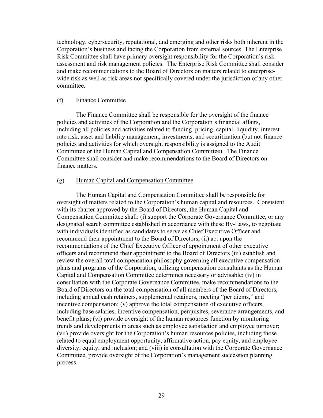 29 technology, cybersecurity, reputational, and emerging and other risks both inherent in the Corporation’s business and facing the Corporation from external sources. The Enterprise Risk Committee shall have primary oversight responsibility for the Corporation’s risk assessment and risk management policies. The Enterprise Risk Committee shall consider and make recommendations to the Board of Directors on matters related to enterprise- wide risk as well as risk areas not specifically covered under the jurisdiction of any other committee. (f) Finance Committee The Finance Committee shall be responsible for the oversight of the finance policies and activities of the Corporation and the Corporation’s financial affairs, including all policies and activities related to funding, pricing, capital, liquidity, interest rate risk, asset and liability management, investments, and securitization (but not finance policies and activities for which oversight responsibility is assigned to the Audit Committee or the Human Capital and Compensation Committee). The Finance Committee shall consider and make recommendations to the Board of Directors on finance matters. (g) Human Capital and Compensation Committee The Human Capital and Compensation Committee shall be responsible for oversight of matters related to the Corporation’s human capital and resources. Consistent with its charter approved by the Board of Directors, the Human Capital and Compensation Committee shall: (i) support the Corporate Governance Committee, or any designated search committee established in accordance with these By-Laws, to negotiate with individuals identified as candidates to serve as Chief Executive Officer and recommend their appointment to the Board of Directors, (ii) act upon the recommendations of the Chief Executive Officer of appointment of other executive officers and recommend their appointment to the Board of Directors (iii) establish and review the overall total compensation philosophy governing all executive compensation plans and programs of the Corporation, utilizing compensation consultants as the Human Capital and Compensation Committee determines necessary or advisable; (iv) in consultation with the Corporate Governance Committee, make recommendations to the Board of Directors on the total compensation of all members of the Board of Directors, including annual cash retainers, supplemental retainers, meeting “per diems,” and incentive compensation; (v) approve the total compensation of executive officers, including base salaries, incentive compensation, perquisites, severance arrangements, and benefit plans; (vi) provide oversight of the human resources function by monitoring trends and developments in areas such as employee satisfaction and employee turnover; (vii) provide oversight for the Corporation’s human resources policies, including those related to equal employment opportunity, affirmative action, pay equity, and employee diversity, equity, and inclusion; and (viii) in consultation with the Corporate Governance Committee, provide oversight of the Corporation’s management succession planning process.