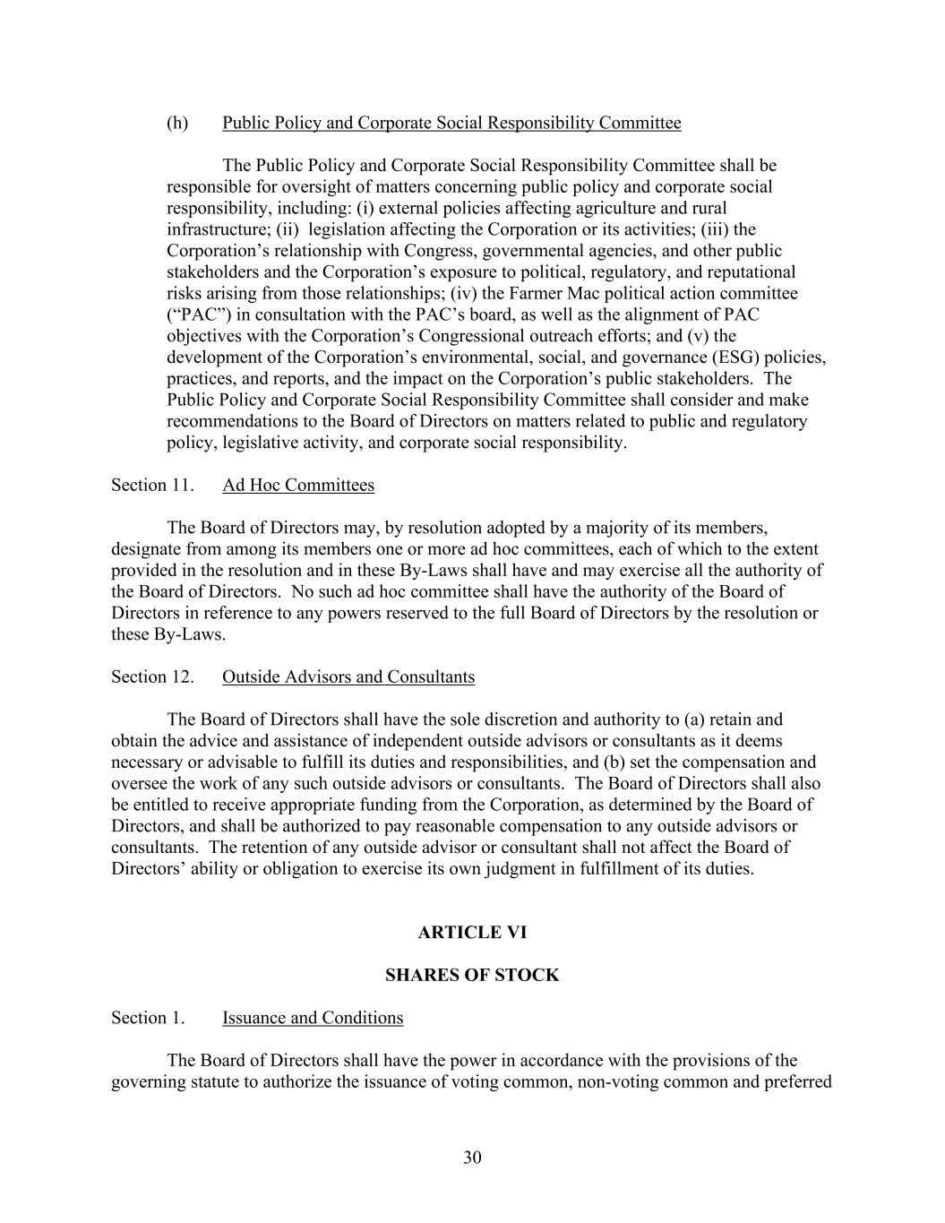 30 (h) Public Policy and Corporate Social Responsibility Committee The Public Policy and Corporate Social Responsibility Committee shall be responsible for oversight of matters concerning public policy and corporate social responsibility, including: (i) external policies affecting agriculture and rural infrastructure; (ii) legislation affecting the Corporation or its activities; (iii) the Corporation’s relationship with Congress, governmental agencies, and other public stakeholders and the Corporation’s exposure to political, regulatory, and reputational risks arising from those relationships; (iv) the Farmer Mac political action committee (“PAC”) in consultation with the PAC’s board, as well as the alignment of PAC objectives with the Corporation’s Congressional outreach efforts; and (v) the development of the Corporation’s environmental, social, and governance (ESG) policies, practices, and reports, and the impact on the Corporation’s public stakeholders. The Public Policy and Corporate Social Responsibility Committee shall consider and make recommendations to the Board of Directors on matters related to public and regulatory policy, legislative activity, and corporate social responsibility. Section 11. Ad Hoc Committees The Board of Directors may, by resolution adopted by a majority of its members, designate from among its members one or more ad hoc committees, each of which to the extent provided in the resolution and in these By-Laws shall have and may exercise all the authority of the Board of Directors. No such ad hoc committee shall have the authority of the Board of Directors in reference to any powers reserved to the full Board of Directors by the resolution or these By-Laws. Section 12. Outside Advisors and Consultants The Board of Directors shall have the sole discretion and authority to (a) retain and obtain the advice and assistance of independent outside advisors or consultants as it deems necessary or advisable to fulfill its duties and responsibilities, and (b) set the compensation and oversee the work of any such outside advisors or consultants. The Board of Directors shall also be entitled to receive appropriate funding from the Corporation, as determined by the Board of Directors, and shall be authorized to pay reasonable compensation to any outside advisors or consultants. The retention of any outside advisor or consultant shall not affect the Board of Directors’ ability or obligation to exercise its own judgment in fulfillment of its duties. ARTICLE VI SHARES OF STOCK Section 1. Issuance and Conditions The Board of Directors shall have the power in accordance with the provisions of the governing statute to authorize the issuance of voting common, non-voting common and preferred