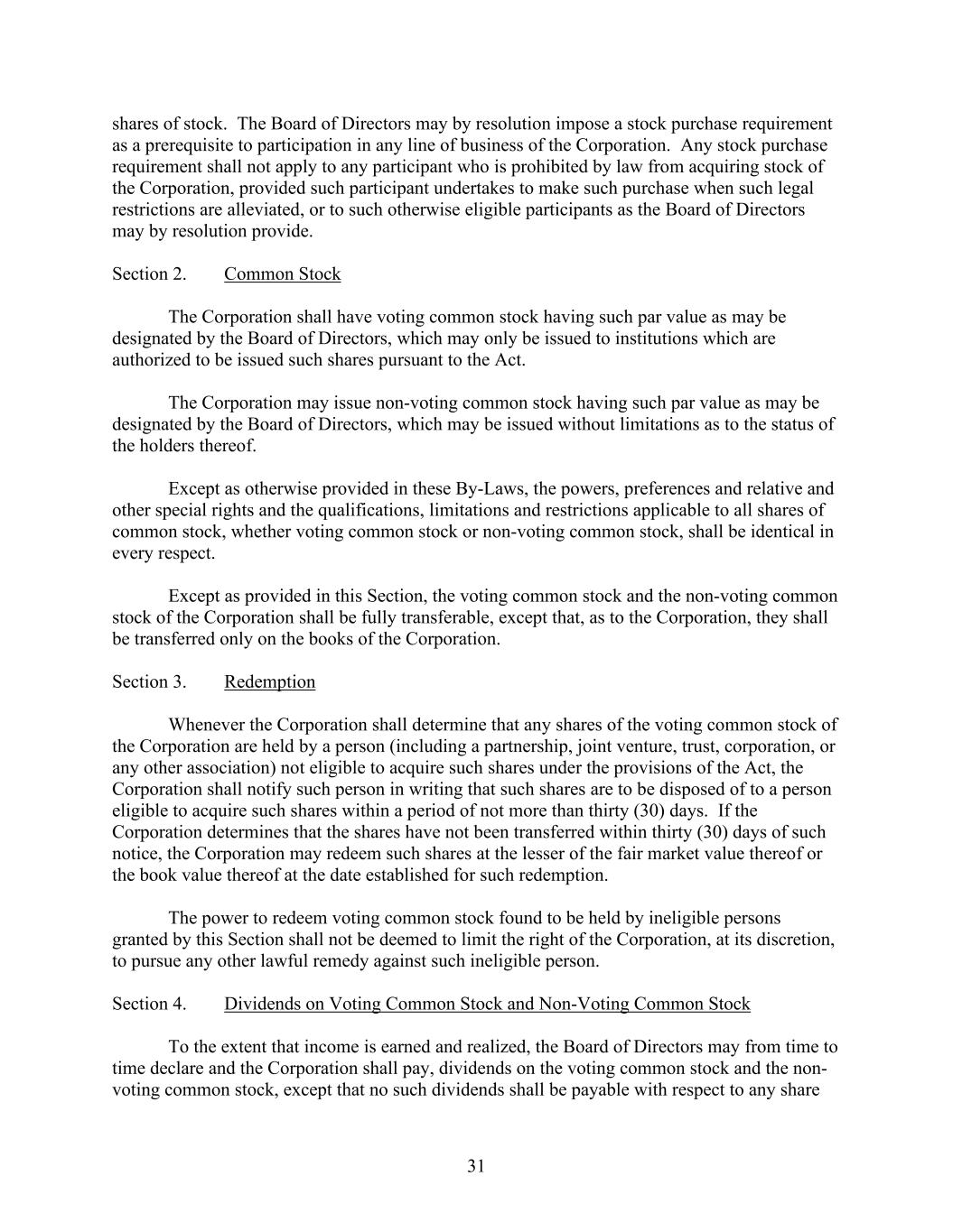 31 shares of stock. The Board of Directors may by resolution impose a stock purchase requirement as a prerequisite to participation in any line of business of the Corporation. Any stock purchase requirement shall not apply to any participant who is prohibited by law from acquiring stock of the Corporation, provided such participant undertakes to make such purchase when such legal restrictions are alleviated, or to such otherwise eligible participants as the Board of Directors may by resolution provide. Section 2. Common Stock The Corporation shall have voting common stock having such par value as may be designated by the Board of Directors, which may only be issued to institutions which are authorized to be issued such shares pursuant to the Act. The Corporation may issue non-voting common stock having such par value as may be designated by the Board of Directors, which may be issued without limitations as to the status of the holders thereof. Except as otherwise provided in these By-Laws, the powers, preferences and relative and other special rights and the qualifications, limitations and restrictions applicable to all shares of common stock, whether voting common stock or non-voting common stock, shall be identical in every respect. Except as provided in this Section, the voting common stock and the non-voting common stock of the Corporation shall be fully transferable, except that, as to the Corporation, they shall be transferred only on the books of the Corporation. Section 3. Redemption Whenever the Corporation shall determine that any shares of the voting common stock of the Corporation are held by a person (including a partnership, joint venture, trust, corporation, or any other association) not eligible to acquire such shares under the provisions of the Act, the Corporation shall notify such person in writing that such shares are to be disposed of to a person eligible to acquire such shares within a period of not more than thirty (30) days. If the Corporation determines that the shares have not been transferred within thirty (30) days of such notice, the Corporation may redeem such shares at the lesser of the fair market value thereof or the book value thereof at the date established for such redemption. The power to redeem voting common stock found to be held by ineligible persons granted by this Section shall not be deemed to limit the right of the Corporation, at its discretion, to pursue any other lawful remedy against such ineligible person. Section 4. Dividends on Voting Common Stock and Non-Voting Common Stock To the extent that income is earned and realized, the Board of Directors may from time to time declare and the Corporation shall pay, dividends on the voting common stock and the non- voting common stock, except that no such dividends shall be payable with respect to any share