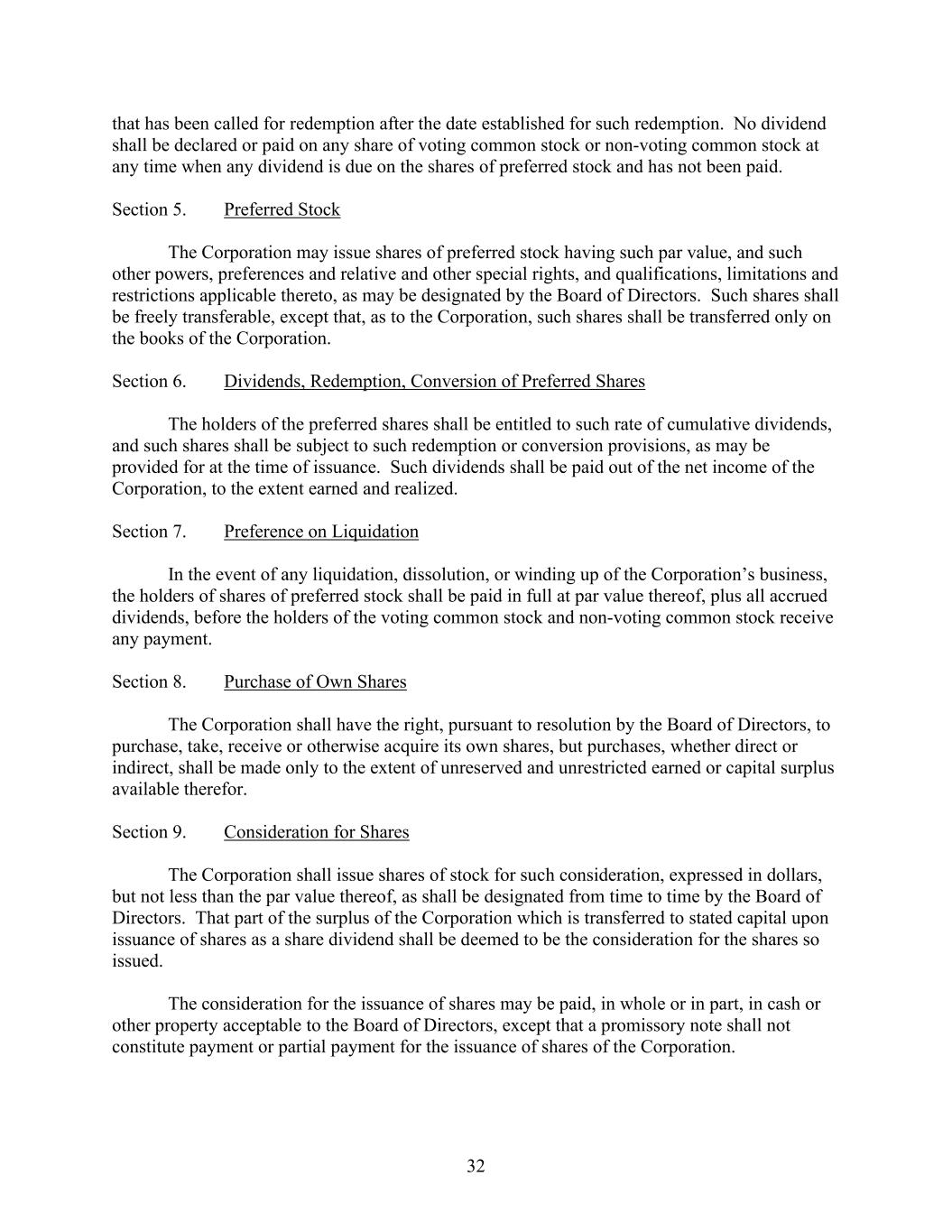 32 that has been called for redemption after the date established for such redemption. No dividend shall be declared or paid on any share of voting common stock or non-voting common stock at any time when any dividend is due on the shares of preferred stock and has not been paid. Section 5. Preferred Stock The Corporation may issue shares of preferred stock having such par value, and such other powers, preferences and relative and other special rights, and qualifications, limitations and restrictions applicable thereto, as may be designated by the Board of Directors. Such shares shall be freely transferable, except that, as to the Corporation, such shares shall be transferred only on the books of the Corporation. Section 6. Dividends, Redemption, Conversion of Preferred Shares The holders of the preferred shares shall be entitled to such rate of cumulative dividends, and such shares shall be subject to such redemption or conversion provisions, as may be provided for at the time of issuance. Such dividends shall be paid out of the net income of the Corporation, to the extent earned and realized. Section 7. Preference on Liquidation In the event of any liquidation, dissolution, or winding up of the Corporation’s business, the holders of shares of preferred stock shall be paid in full at par value thereof, plus all accrued dividends, before the holders of the voting common stock and non-voting common stock receive any payment. Section 8. Purchase of Own Shares The Corporation shall have the right, pursuant to resolution by the Board of Directors, to purchase, take, receive or otherwise acquire its own shares, but purchases, whether direct or indirect, shall be made only to the extent of unreserved and unrestricted earned or capital surplus available therefor. Section 9. Consideration for Shares The Corporation shall issue shares of stock for such consideration, expressed in dollars, but not less than the par value thereof, as shall be designated from time to time by the Board of Directors. That part of the surplus of the Corporation which is transferred to stated capital upon issuance of shares as a share dividend shall be deemed to be the consideration for the shares so issued. The consideration for the issuance of shares may be paid, in whole or in part, in cash or other property acceptable to the Board of Directors, except that a promissory note shall not constitute payment or partial payment for the issuance of shares of the Corporation.