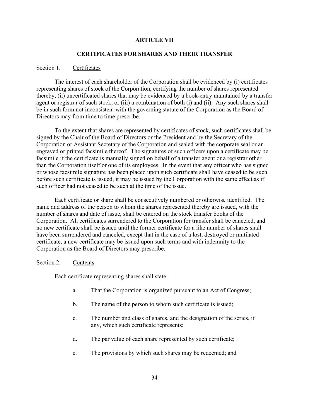 34 ARTICLE VII CERTIFICATES FOR SHARES AND THEIR TRANSFER Section 1. Certificates The interest of each shareholder of the Corporation shall be evidenced by (i) certificates representing shares of stock of the Corporation, certifying the number of shares represented thereby, (ii) uncertificated shares that may be evidenced by a book-entry maintained by a transfer agent or registrar of such stock, or (iii) a combination of both (i) and (ii). Any such shares shall be in such form not inconsistent with the governing statute of the Corporation as the Board of Directors may from time to time prescribe. To the extent that shares are represented by certificates of stock, such certificates shall be signed by the Chair of the Board of Directors or the President and by the Secretary of the Corporation or Assistant Secretary of the Corporation and sealed with the corporate seal or an engraved or printed facsimile thereof. The signatures of such officers upon a certificate may be facsimile if the certificate is manually signed on behalf of a transfer agent or a registrar other than the Corporation itself or one of its employees. In the event that any officer who has signed or whose facsimile signature has been placed upon such certificate shall have ceased to be such before such certificate is issued, it may be issued by the Corporation with the same effect as if such officer had not ceased to be such at the time of the issue. Each certificate or share shall be consecutively numbered or otherwise identified. The name and address of the person to whom the shares represented thereby are issued, with the number of shares and date of issue, shall be entered on the stock transfer books of the Corporation. All certificates surrendered to the Corporation for transfer shall be canceled, and no new certificate shall be issued until the former certificate for a like number of shares shall have been surrendered and canceled, except that in the case of a lost, destroyed or mutilated certificate, a new certificate may be issued upon such terms and with indemnity to the Corporation as the Board of Directors may prescribe. Section 2. Contents Each certificate representing shares shall state: a. That the Corporation is organized pursuant to an Act of Congress; b. The name of the person to whom such certificate is issued; c. The number and class of shares, and the designation of the series, if any, which such certificate represents; d. The par value of each share represented by such certificate; e. The provisions by which such shares may be redeemed; and