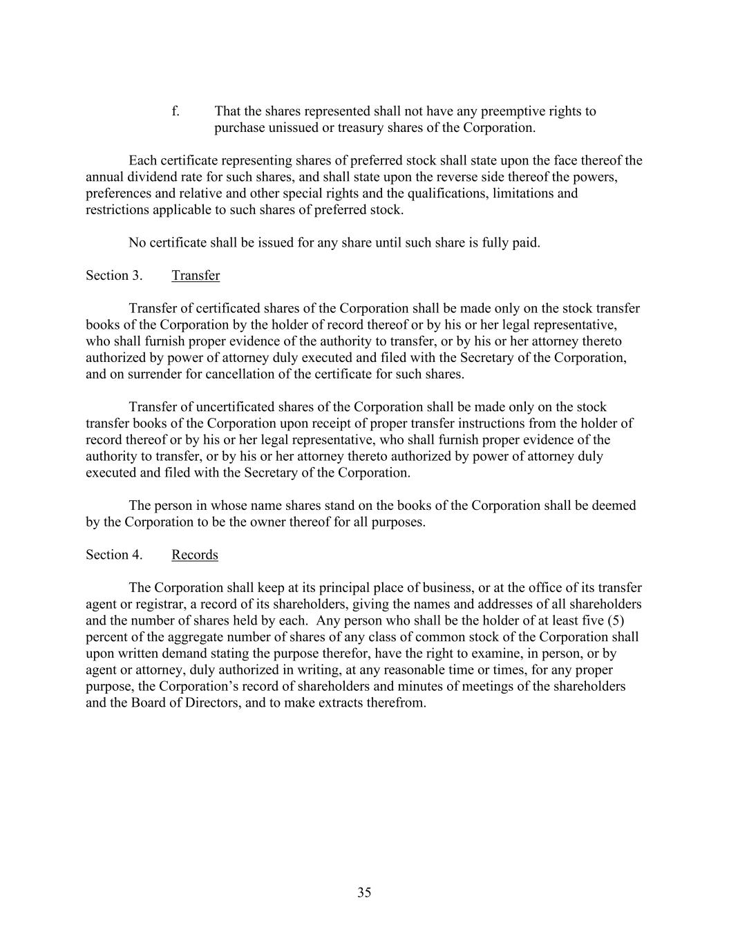 35 f. That the shares represented shall not have any preemptive rights to purchase unissued or treasury shares of the Corporation. Each certificate representing shares of preferred stock shall state upon the face thereof the annual dividend rate for such shares, and shall state upon the reverse side thereof the powers, preferences and relative and other special rights and the qualifications, limitations and restrictions applicable to such shares of preferred stock. No certificate shall be issued for any share until such share is fully paid. Section 3. Transfer Transfer of certificated shares of the Corporation shall be made only on the stock transfer books of the Corporation by the holder of record thereof or by his or her legal representative, who shall furnish proper evidence of the authority to transfer, or by his or her attorney thereto authorized by power of attorney duly executed and filed with the Secretary of the Corporation, and on surrender for cancellation of the certificate for such shares. Transfer of uncertificated shares of the Corporation shall be made only on the stock transfer books of the Corporation upon receipt of proper transfer instructions from the holder of record thereof or by his or her legal representative, who shall furnish proper evidence of the authority to transfer, or by his or her attorney thereto authorized by power of attorney duly executed and filed with the Secretary of the Corporation. The person in whose name shares stand on the books of the Corporation shall be deemed by the Corporation to be the owner thereof for all purposes. Section 4. Records The Corporation shall keep at its principal place of business, or at the office of its transfer agent or registrar, a record of its shareholders, giving the names and addresses of all shareholders and the number of shares held by each. Any person who shall be the holder of at least five (5) percent of the aggregate number of shares of any class of common stock of the Corporation shall upon written demand stating the purpose therefor, have the right to examine, in person, or by agent or attorney, duly authorized in writing, at any reasonable time or times, for any proper purpose, the Corporation’s record of shareholders and minutes of meetings of the shareholders and the Board of Directors, and to make extracts therefrom.
