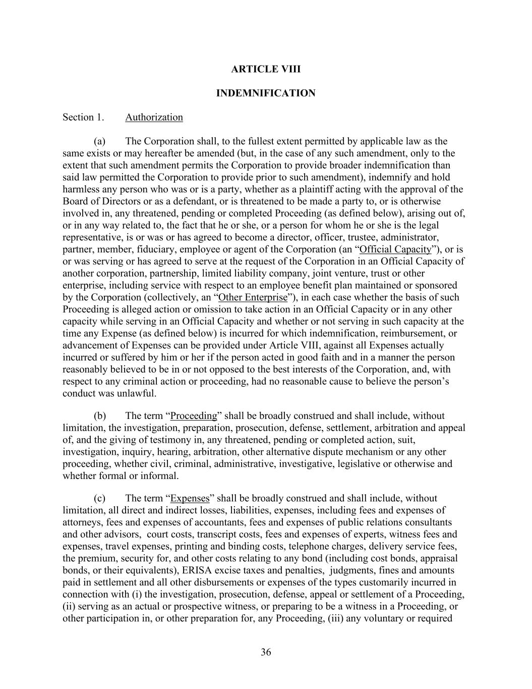 36 ARTICLE VIII INDEMNIFICATION Section 1. Authorization (a) The Corporation shall, to the fullest extent permitted by applicable law as the same exists or may hereafter be amended (but, in the case of any such amendment, only to the extent that such amendment permits the Corporation to provide broader indemnification than said law permitted the Corporation to provide prior to such amendment), indemnify and hold harmless any person who was or is a party, whether as a plaintiff acting with the approval of the Board of Directors or as a defendant, or is threatened to be made a party to, or is otherwise involved in, any threatened, pending or completed Proceeding (as defined below), arising out of, or in any way related to, the fact that he or she, or a person for whom he or she is the legal representative, is or was or has agreed to become a director, officer, trustee, administrator, partner, member, fiduciary, employee or agent of the Corporation (an “Official Capacity”), or is or was serving or has agreed to serve at the request of the Corporation in an Official Capacity of another corporation, partnership, limited liability company, joint venture, trust or other enterprise, including service with respect to an employee benefit plan maintained or sponsored by the Corporation (collectively, an “Other Enterprise”), in each case whether the basis of such Proceeding is alleged action or omission to take action in an Official Capacity or in any other capacity while serving in an Official Capacity and whether or not serving in such capacity at the time any Expense (as defined below) is incurred for which indemnification, reimbursement, or advancement of Expenses can be provided under Article VIII, against all Expenses actually incurred or suffered by him or her if the person acted in good faith and in a manner the person reasonably believed to be in or not opposed to the best interests of the Corporation, and, with respect to any criminal action or proceeding, had no reasonable cause to believe the person’s conduct was unlawful. (b) The term “Proceeding” shall be broadly construed and shall include, without limitation, the investigation, preparation, prosecution, defense, settlement, arbitration and appeal of, and the giving of testimony in, any threatened, pending or completed action, suit, investigation, inquiry, hearing, arbitration, other alternative dispute mechanism or any other proceeding, whether civil, criminal, administrative, investigative, legislative or otherwise and whether formal or informal. (c) The term “Expenses” shall be broadly construed and shall include, without limitation, all direct and indirect losses, liabilities, expenses, including fees and expenses of attorneys, fees and expenses of accountants, fees and expenses of public relations consultants and other advisors, court costs, transcript costs, fees and expenses of experts, witness fees and expenses, travel expenses, printing and binding costs, telephone charges, delivery service fees, the premium, security for, and other costs relating to any bond (including cost bonds, appraisal bonds, or their equivalents), ERISA excise taxes and penalties, judgments, fines and amounts paid in settlement and all other disbursements or expenses of the types customarily incurred in connection with (i) the investigation, prosecution, defense, appeal or settlement of a Proceeding, (ii) serving as an actual or prospective witness, or preparing to be a witness in a Proceeding, or other participation in, or other preparation for, any Proceeding, (iii) any voluntary or required