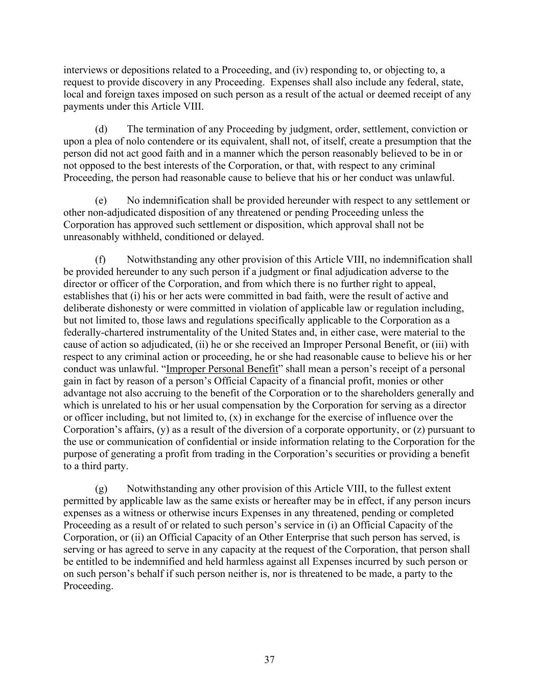 37 interviews or depositions related to a Proceeding, and (iv) responding to, or objecting to, a request to provide discovery in any Proceeding. Expenses shall also include any federal, state, local and foreign taxes imposed on such person as a result of the actual or deemed receipt of any payments under this Article VIII. (d) The termination of any Proceeding by judgment, order, settlement, conviction or upon a plea of nolo contendere or its equivalent, shall not, of itself, create a presumption that the person did not act good faith and in a manner which the person reasonably believed to be in or not opposed to the best interests of the Corporation, or that, with respect to any criminal Proceeding, the person had reasonable cause to believe that his or her conduct was unlawful. (e) No indemnification shall be provided hereunder with respect to any settlement or other non-adjudicated disposition of any threatened or pending Proceeding unless the Corporation has approved such settlement or disposition, which approval shall not be unreasonably withheld, conditioned or delayed. (f) Notwithstanding any other provision of this Article VIII, no indemnification shall be provided hereunder to any such person if a judgment or final adjudication adverse to the director or officer of the Corporation, and from which there is no further right to appeal, establishes that (i) his or her acts were committed in bad faith, were the result of active and deliberate dishonesty or were committed in violation of applicable law or regulation including, but not limited to, those laws and regulations specifically applicable to the Corporation as a federally-chartered instrumentality of the United States and, in either case, were material to the cause of action so adjudicated, (ii) he or she received an Improper Personal Benefit, or (iii) with respect to any criminal action or proceeding, he or she had reasonable cause to believe his or her conduct was unlawful. “Improper Personal Benefit” shall mean a person’s receipt of a personal gain in fact by reason of a person’s Official Capacity of a financial profit, monies or other advantage not also accruing to the benefit of the Corporation or to the shareholders generally and which is unrelated to his or her usual compensation by the Corporation for serving as a director or officer including, but not limited to, (x) in exchange for the exercise of influence over the Corporation’s affairs, (y) as a result of the diversion of a corporate opportunity, or (z) pursuant to the use or communication of confidential or inside information relating to the Corporation for the purpose of generating a profit from trading in the Corporation’s securities or providing a benefit to a third party. (g) Notwithstanding any other provision of this Article VIII, to the fullest extent permitted by applicable law as the same exists or hereafter may be in effect, if any person incurs expenses as a witness or otherwise incurs Expenses in any threatened, pending or completed Proceeding as a result of or related to such person’s service in (i) an Official Capacity of the Corporation, or (ii) an Official Capacity of an Other Enterprise that such person has served, is serving or has agreed to serve in any capacity at the request of the Corporation, that person shall be entitled to be indemnified and held harmless against all Expenses incurred by such person or on such person’s behalf if such person neither is, nor is threatened to be made, a party to the Proceeding.